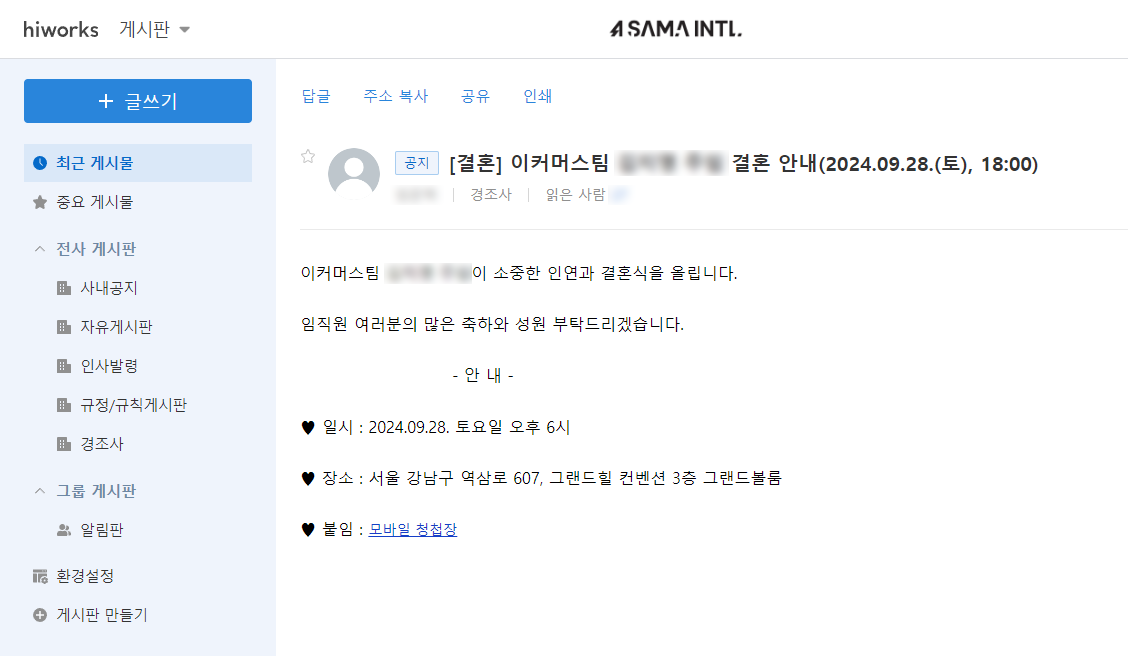 오늘은 삼아인터내셔날 임직원의 두번째* 결혼 이야기를 포스팅합니다. 사실 몇 달 전부터 여러 번 스포의 기회가 있었으나 익명의 아르코님이 결혼식 당일까지 기다려 달라고 하셔서... 2024년 9월 28일 토요일 오후 6시 예식을 모두 치른 후, 갓 받아든 따끈따끈한 사진으로 그 날의 정취와 기억을 박제하려 합니다.
