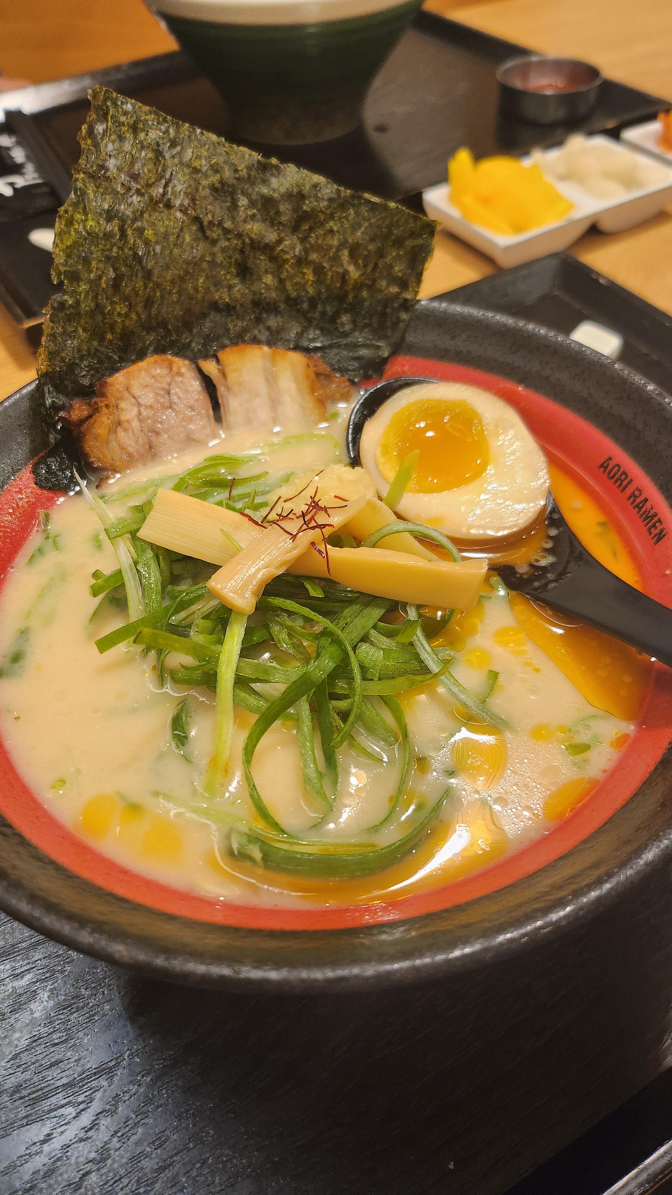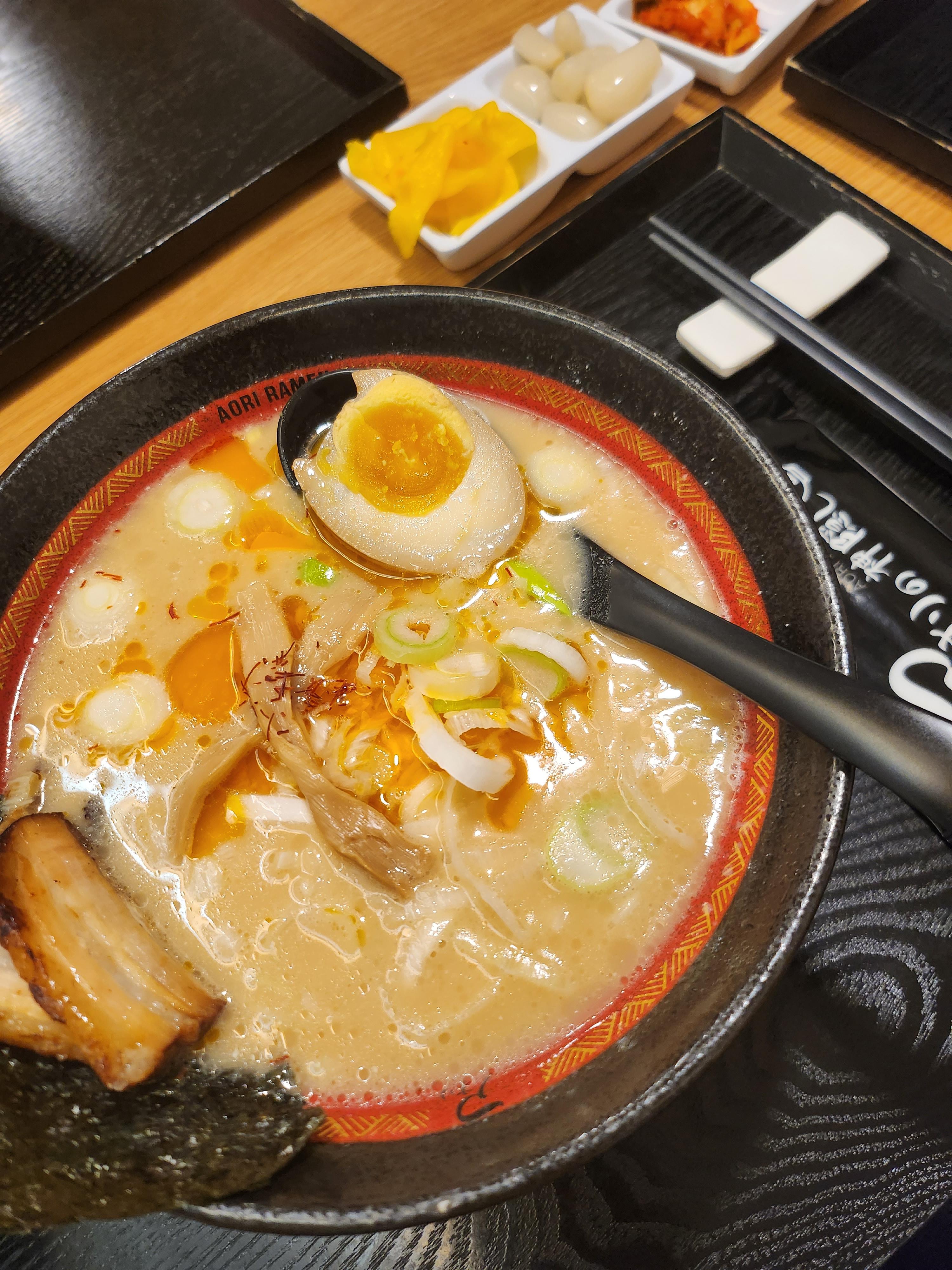 아~ 여기는... 공개하면 안되는데. 더 유명해지면 안되는데. 빅뱅 멤버 승리의 절호의 사업템이었던 아오리의 행방불명이(일명 '승리라멘') 아직 사라지지 않은 채 여의도에서 직장인의 쓰린 속을 달래주고 있습니다. 가끔 매장에서 빅뱅 히트곡이 나오면 좀 웃프기도 하더라구요. 한 때 대한민국을 들썩이게 했던 오너 리스크를 딛고 매장 점주들끼리 레시피만 그대로 유지해서 판매중인 것 같았어요. 저는 원래도 아오리라멘을 좋아했던지라 여의도 한복판에서 웨이팅 없이 진한 라멘 국물을 맛볼 수 있어서 너무 좋았네요.