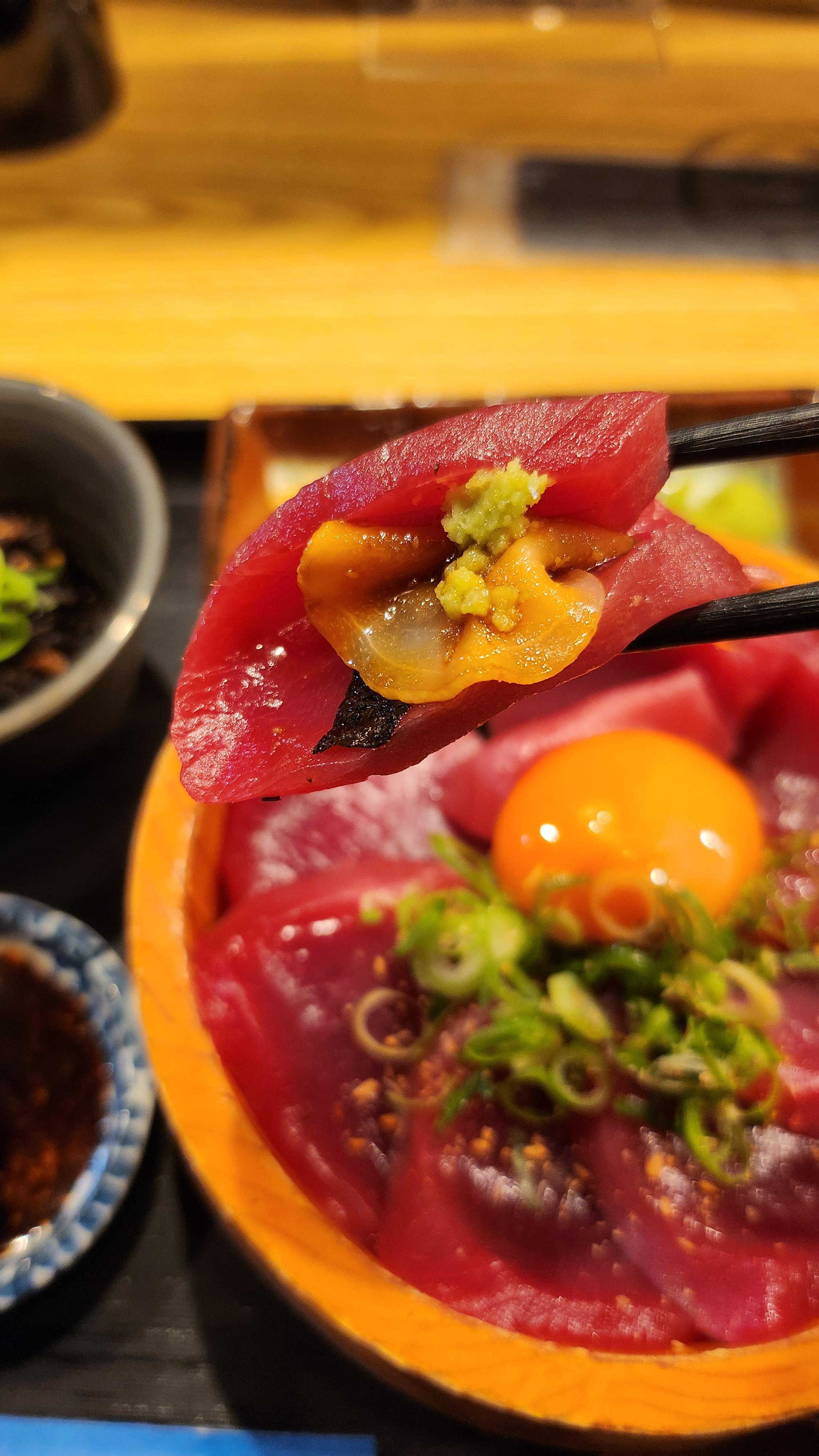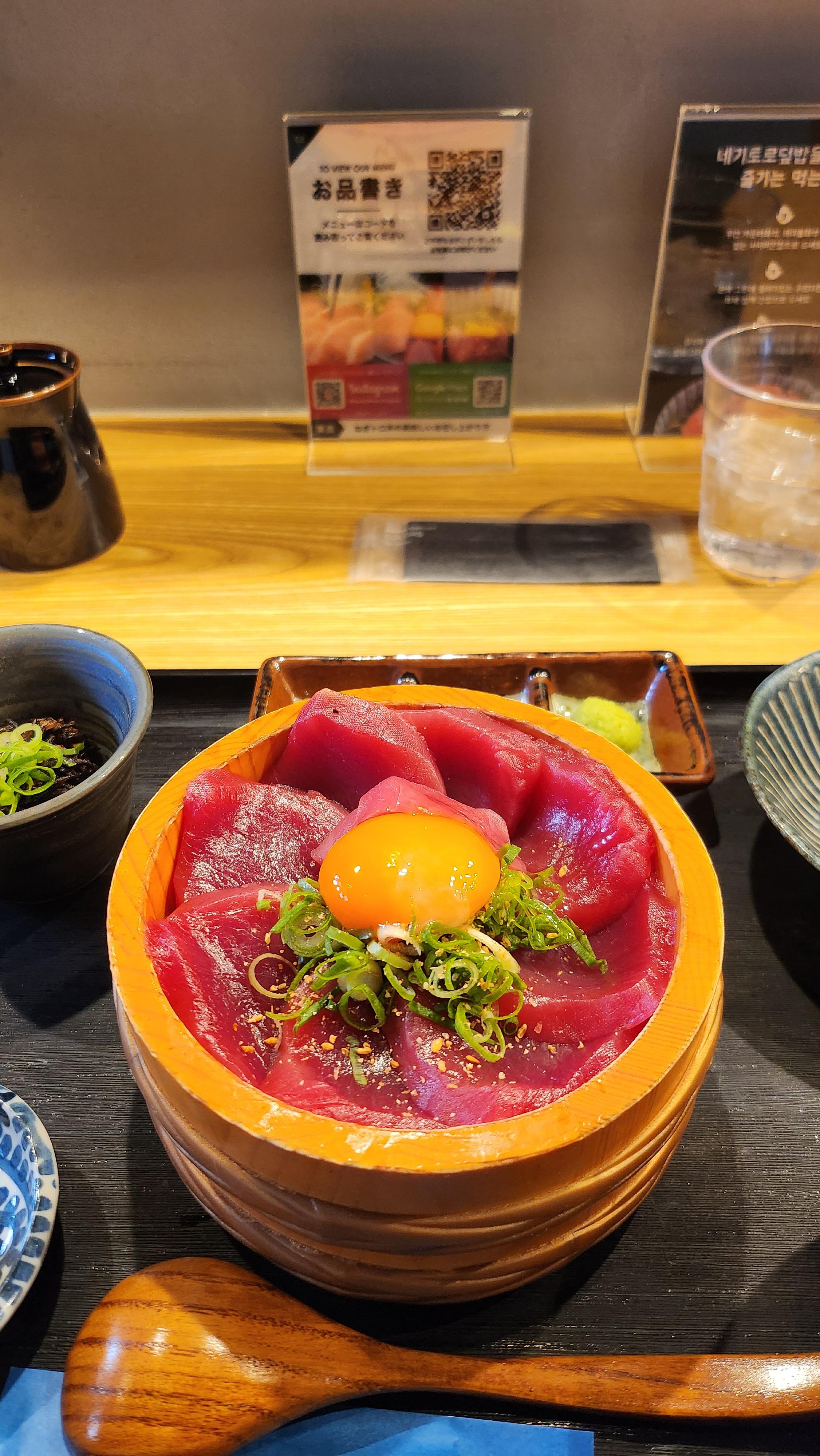 제가 주문한 메뉴명이 뭐더라... 다랑어덮밥이네요! 구글맵에서 찾아볼 때는 메뉴판이 예전 버전이라 가격이 인상됐다는 걸 눈치채지 못했었는데 QR로 메뉴판을 인식하니 2~3천엔 정도였던 걸로 기억합니다. 일단 모양새가 너무 이쁘고, 맛이 기대한 맛이 아니더라도 인스타 감성은 낭낭하다 생각하며 한 입 먹어봤는데 왠걸, 진짜 너무 맛있는 거예요! 부산 사람인지라 광어회나 해산물은 처돌이라더라도 굳이 참치를 왜 사먹어? 라고 생각했던 제가 미식에 대한 눈을 뜨는 정도의 감격이었다고 해야할까요. 일단 신선한 다랑어의 육질이 살아있었고, 비린맛 제로, 탱글한 육질과 촉촉한 식감, 씹으면 씹을 수록 달큰한 맛이 한 스푼, 또 한 스푼 사라지는 게 아쉬울 정도였어요.