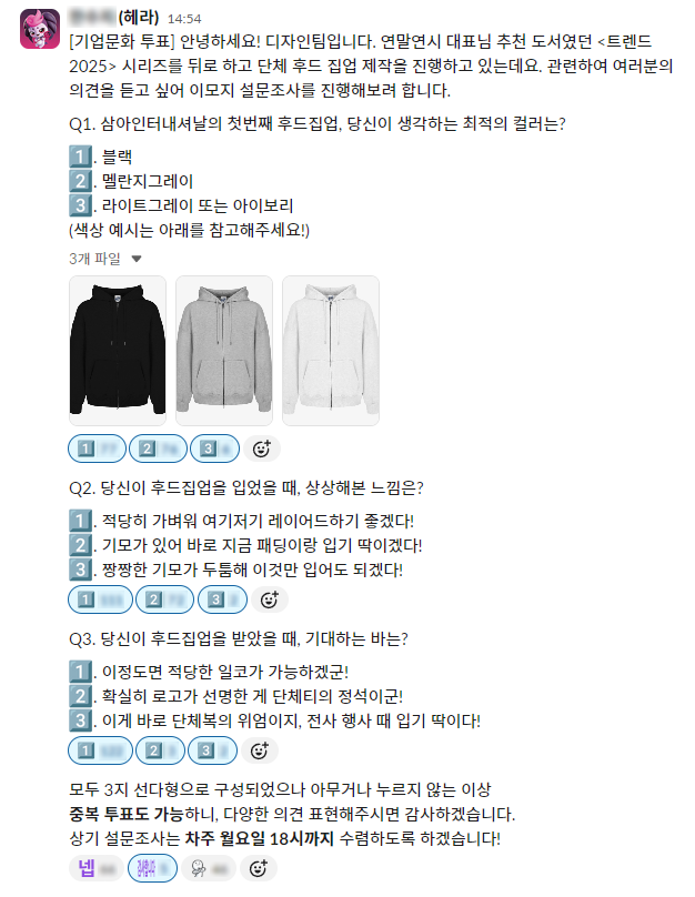 e커머스 산업의 중심에 있기에 가격비교도 놓치지 않고 꼼꼼하게 해봅니다. 저마다 '단체복 맞춤은 우리야!'라고 만들어놓은 홈페이지에 들어가 후기도 읽고, 임직원들의 선호도를 최대한 맞출 수 있는 디자인과 색상을 골라보기도 했습니다. 익명의 똑똑핑님이 전직장에 있을 때는, 동대문으로 직접 발품을 팔았었대요. 제발 거기까지만은 가지 않길 바라며 사이트들을 이 잡듯이 뒤졌습니다. 물론, 임직원들의 선호도 설문조사도 함께 진행했습니다.