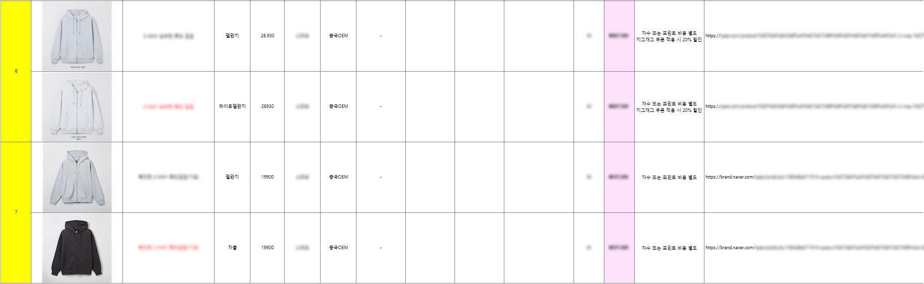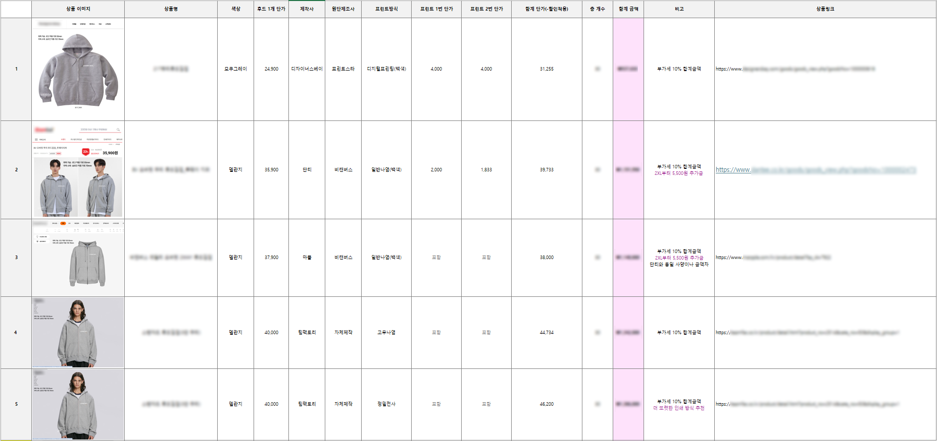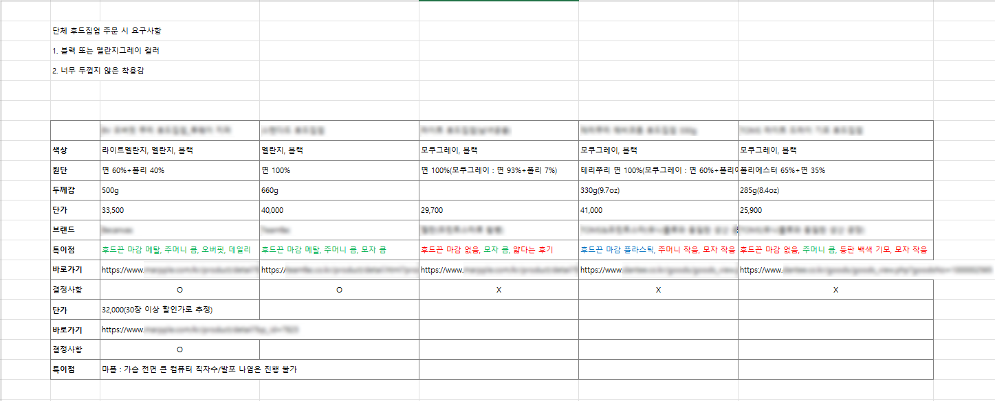 리서치를 진행해보니 단체 후드집업 같은 보편적인 의복은 일명 '무지라벨'로도 불리우는 대표 제작사가 있더라고요. 소재며 핏, 심지어 목 근처 라벨까지 똑같이 박힌 상품인데 가격이 천차만별인 걸 보니 역시 손품발품 팔기 나름이구나 라는 생각이 들기도 했답니다. 리뷰도 하나씩 살펴보며 당장 만져볼 수 없는 원단의 두께감과 자수/프린팅 완성도를 확인해 노트를 남겼습니다.