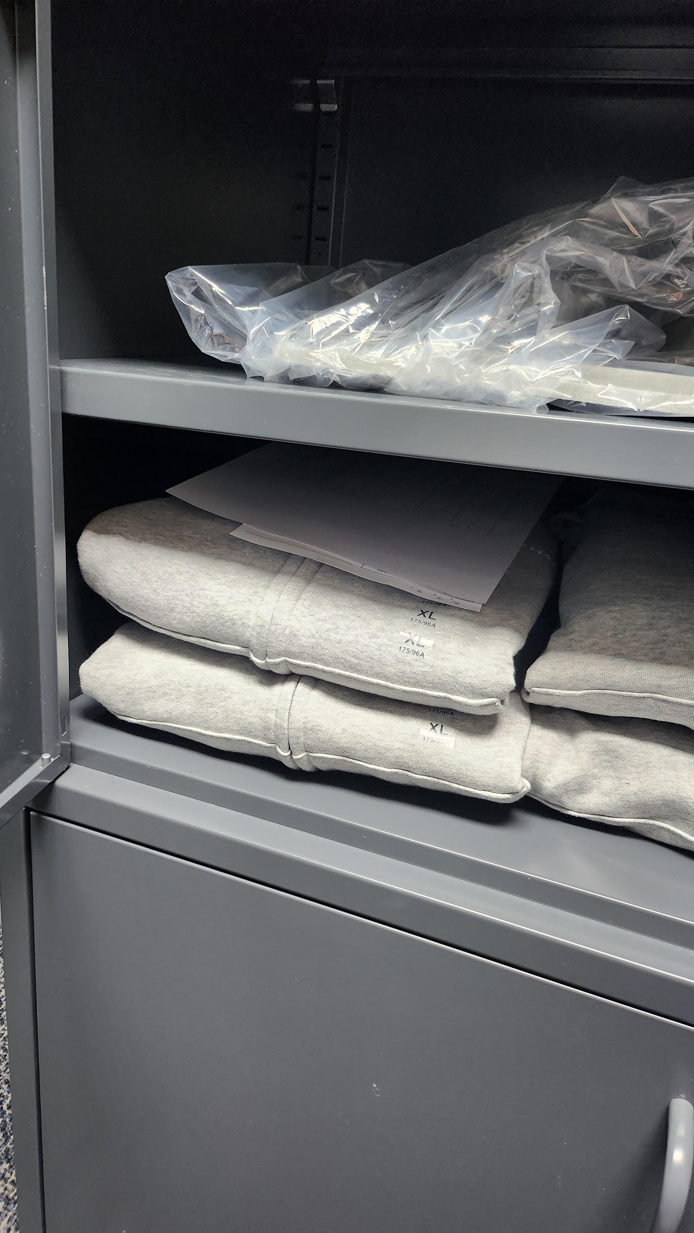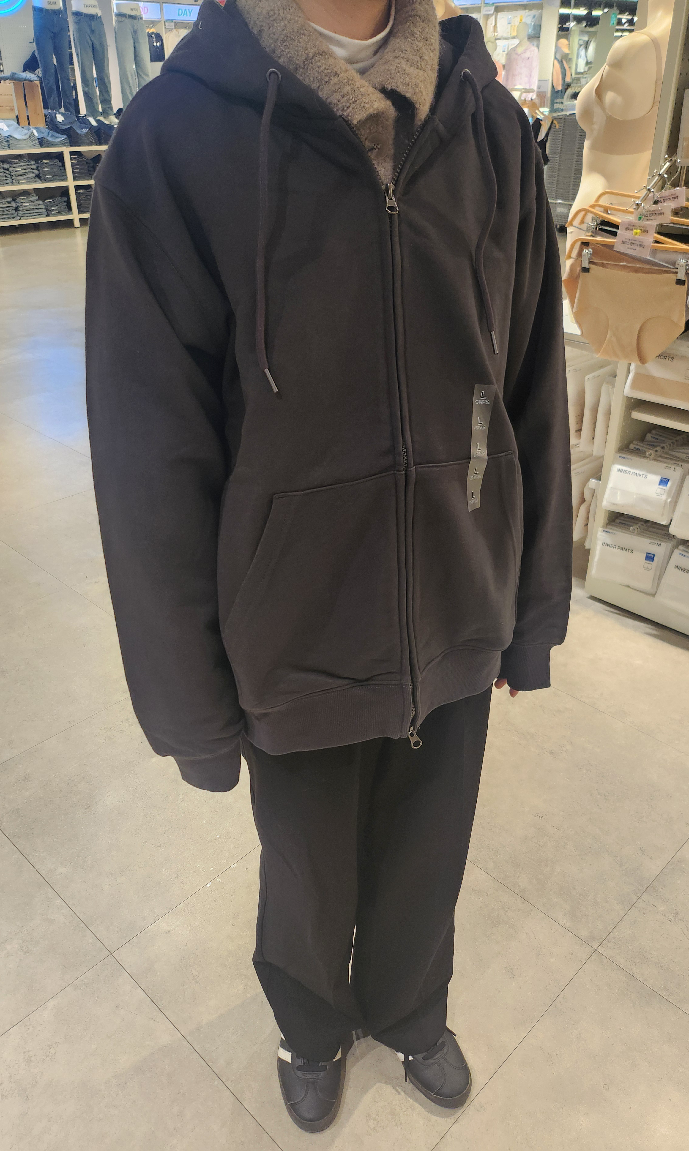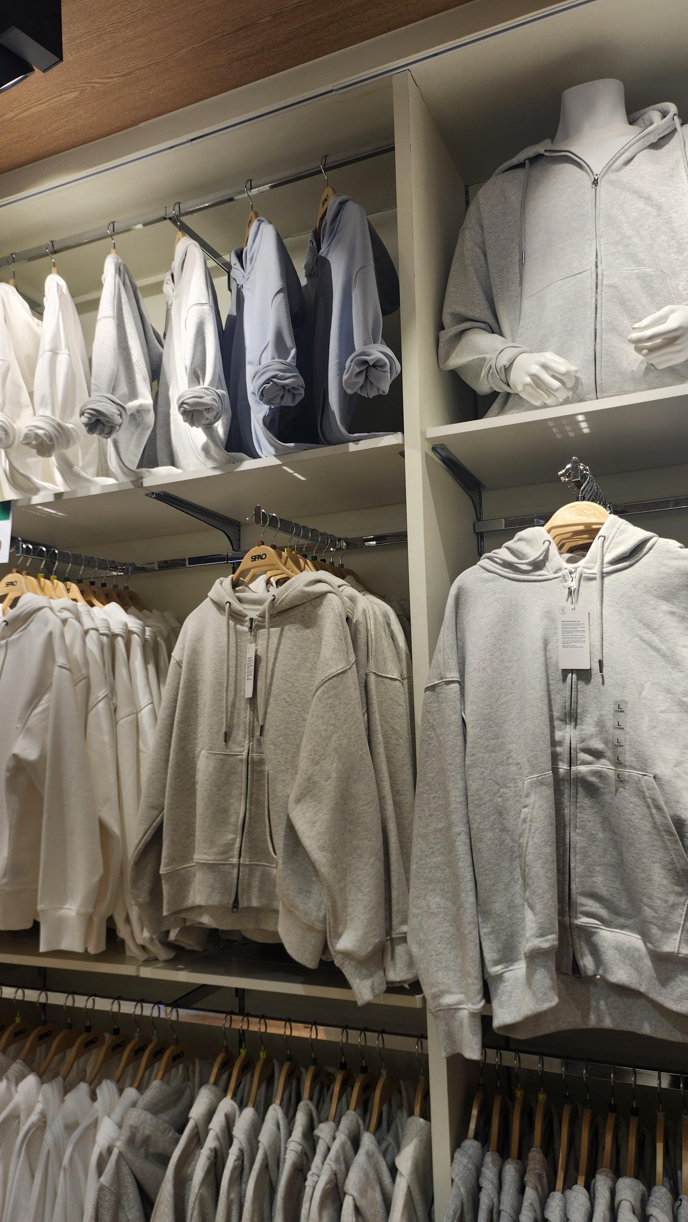 대표님께서 더 짙은 차콜이나 짙은 회색은 어떠냐고 추가 의견을 주셔서 입어보기도 했습니다. 근뎅... 처음부터 그레이 색상 골라주신 건 대표님이자나요...ㅠ 지금 본사 사무실 인테리어랑도 딱 적합한 색상이 멜란지 그레이란 말이예요ㅠㅠ 멜란지그레이는 추리닝의 대표 색상이라 피하고 싶으신가보다 생각하고 살펴봤는데, 비인기 색상이라 그런지 진열 면적도 좁고 확실히 탁한 느낌이 많았습니다. 대표님이 미련을 버리지 못하시면 이 사진이라도 보내드려야겠다 싶어서 사진만 찍어두고, 빠르게 사무실로 복귀합니다. 그리고 안되라는 법만 있는 건 아닌지 한줄기 빛이 저희에게 도달했습니다.
