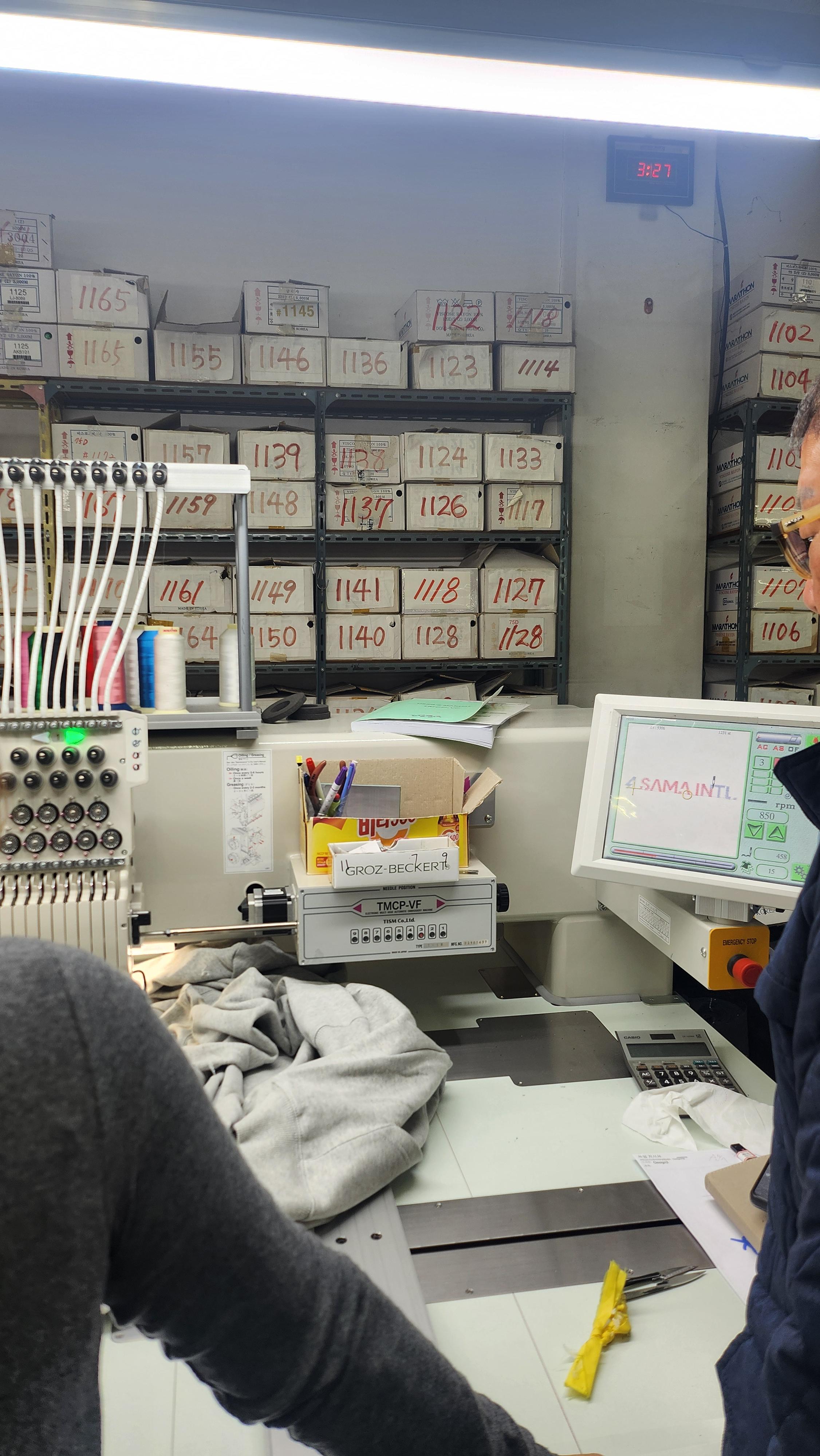 대형 박스 여러개를 들고 도저히 택시나 대중교통을 탈 수는 없을 것 같아 차를 몰고 뛰뛰빵빵 가봅니다. 초보운전에다 초행길인지라 도저히 혼자는 엄두가 안 나 동료들에게 도움을 요청했는데, 흔쾌히 목숨을 걸어주신 모든 분께 감사드립니다. 네이버 지도상으로는 1층이라고 되어있는데, 실제 자수 머신과 사장님이 상주하는 공간은 지하 1층으로 보여 낑낑거리며 박스를 들고 내려갔습니다. 그리고, 왜 그렇게 전화 연결이 어려웠는지 알 수 있게 되었습니다. 자수 머신이 작동하는 소리가 거어어업나 크더라구요. 전화 드리고 찾아뵌 건데도 입구에서 삐쭉거리며 사장님을 세번 정도 부른 후에야 인사를 주고 받을 수 있는 수준이었습니다.