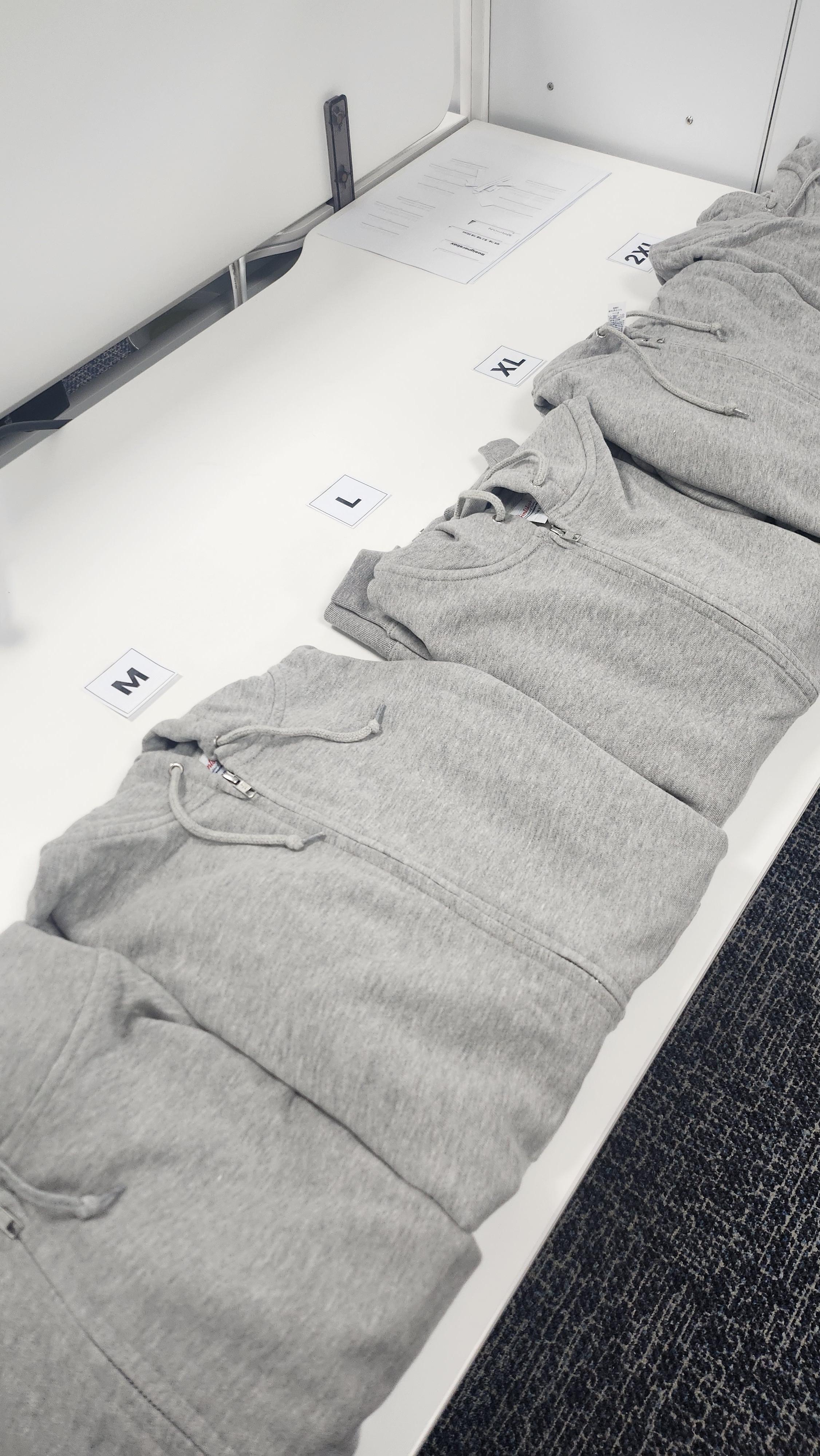 우여곡절 끝에 옷이 도착했습니다. 우리나라 살면서 아마존 해외배송만큼 택배를 오매불망 기다린 적이 또 있었나 싶네요. 각자 희망 사이즈를 기입해둔 용지를 들고 수십명의 임직원에게 배부하기 시작했습니다. "각자 요청했던 사이즈로 배부해드리니, 바로 실착해보시고 하자로 생각되면 보고해달라"구요. 그간 고요하던 사무실이 일순 활기를 띄기 시작합니다. 그리고 싹 걷어왔습니다. 아직 끝이 아니죠. 이제 자수하러 떠나야할 시간입니다.