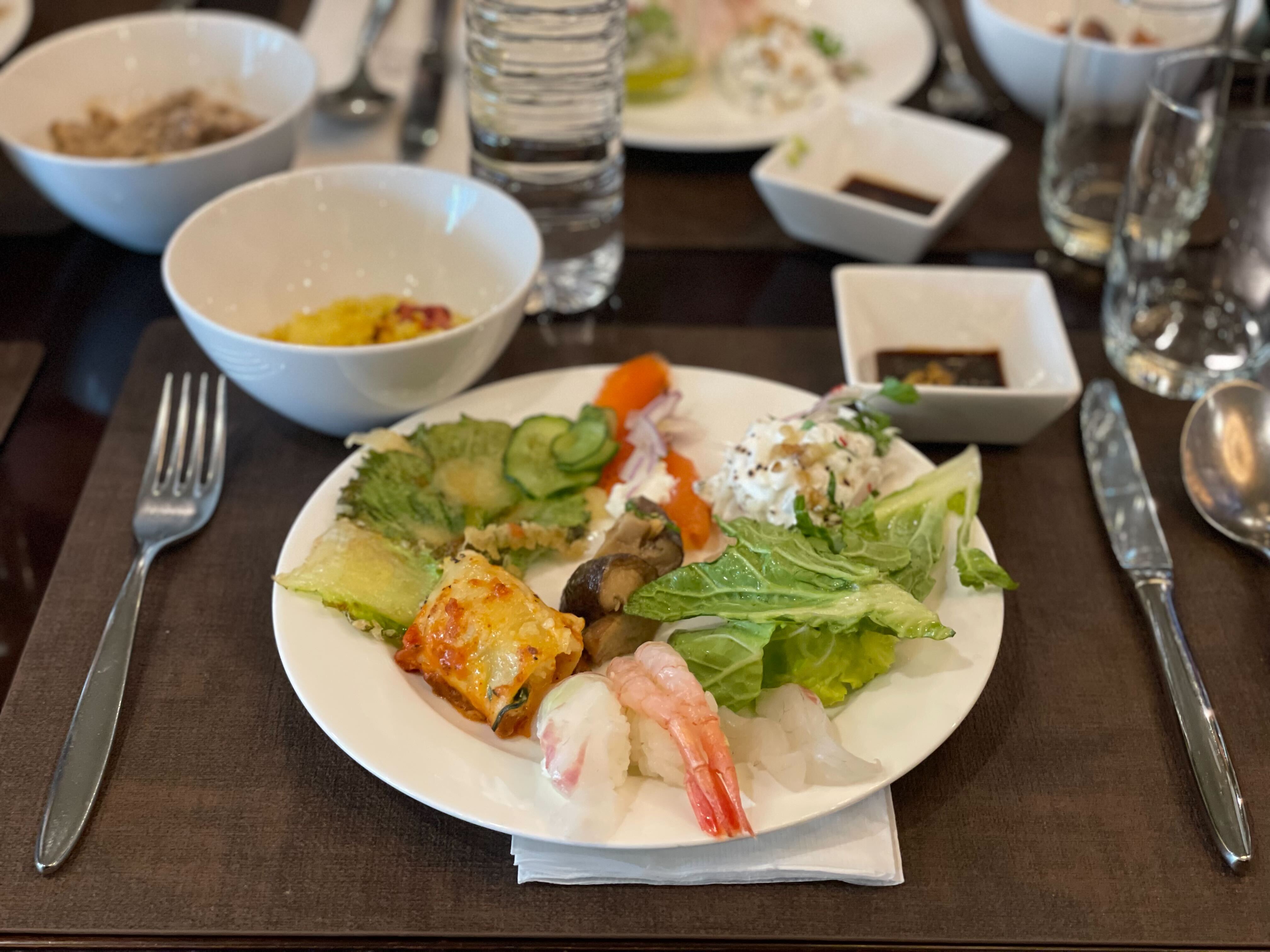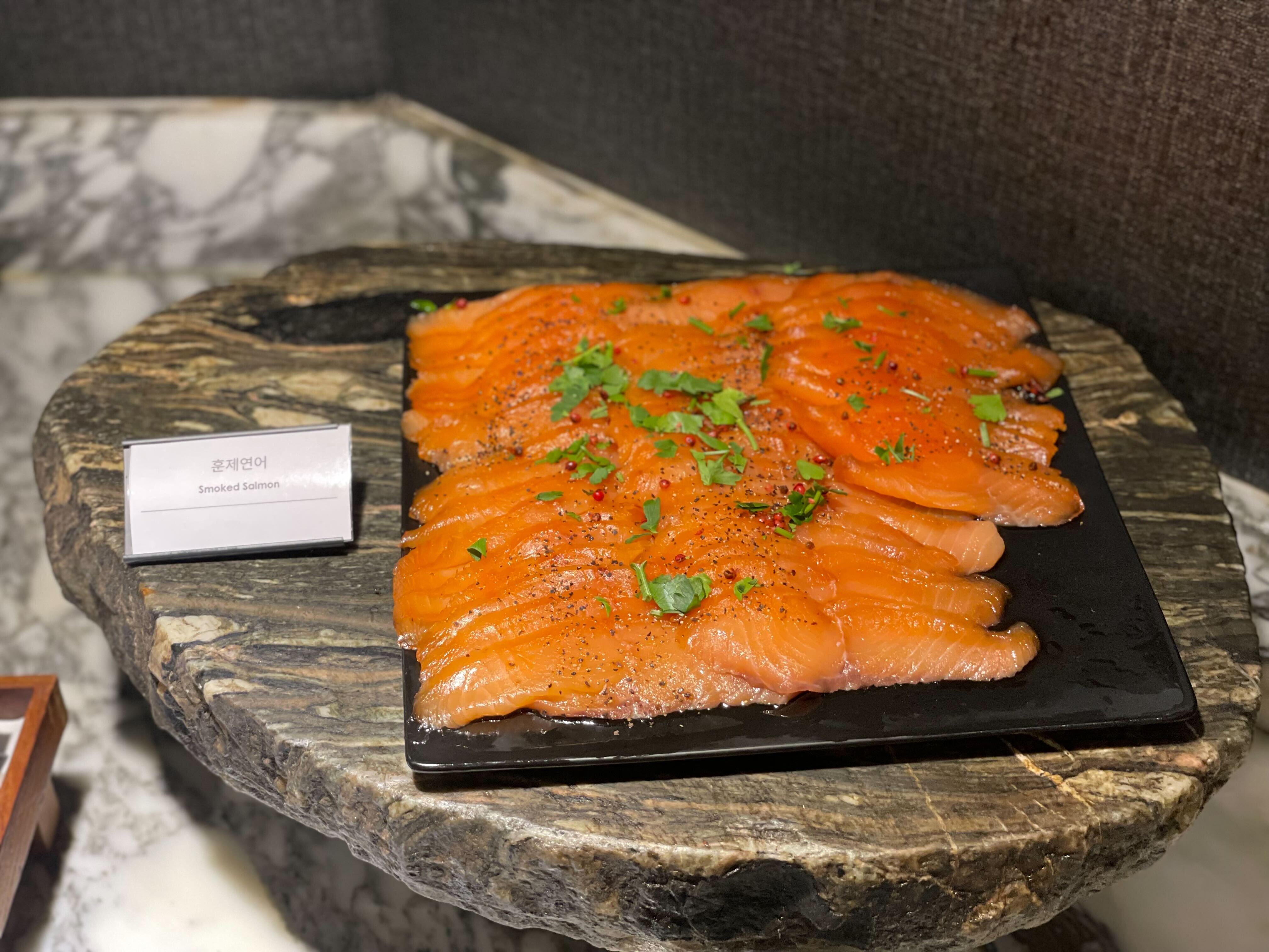 저는 여러 번 일어나는 게 귀찮아서 첫번째 접시를 서빙해두고 바로 두번째 접시를 받았는데요. 호텔 뷔페에서 빵 굽는 기계를 만나면 얼마나 설레는지 몰라요. 막 토스트처럼 튕겨나오는 거 말고 돌돌이처럼 빵 올리고 한바퀴 돌면서 구워주는 방식 있잖아요. 발뮤다고 뭐시기고 저는 암튼 그게 제일 좋더라구요. 그래서 너무 많은 연어에 잘 안보이시겠지만 아래는 제가 눈만 마주쳐도 도키도키하는 빵 굽는 기계에 살짝 구워낸 바게트가 있구요. 훈제 연어 잔뜩 올렸고, 케이퍼랑 선드라이 토마토랑, 홀스래디쉬 소스 듬뿍 담았습니다. 제가 만약 대식가였다면, 세개고 네개고 훈제 연어 오픈 샌드위치만 잔뜩 먹었을텐데. 하나로 족해야하는 설움을 질겅질겅 씹었더니 아쉬워서 더 맛있는 거 있죠.