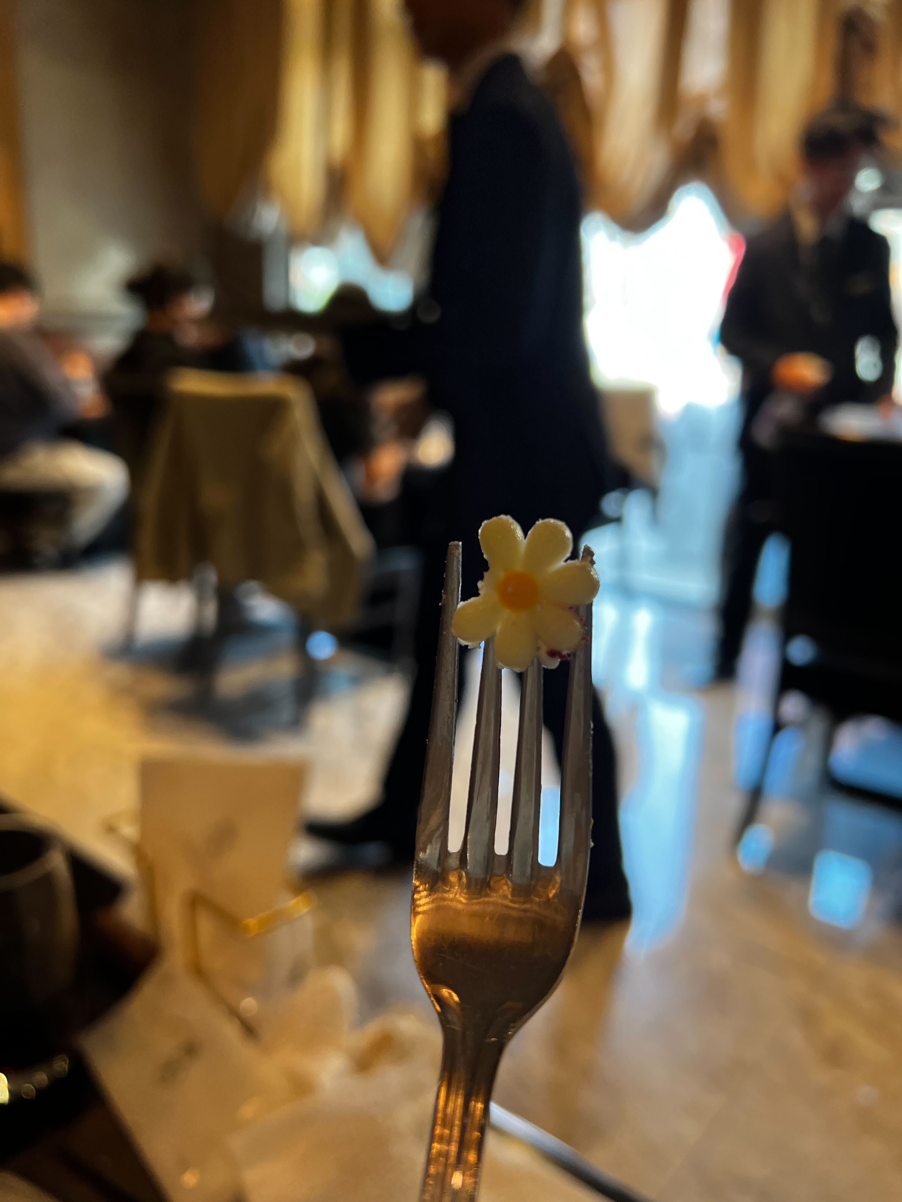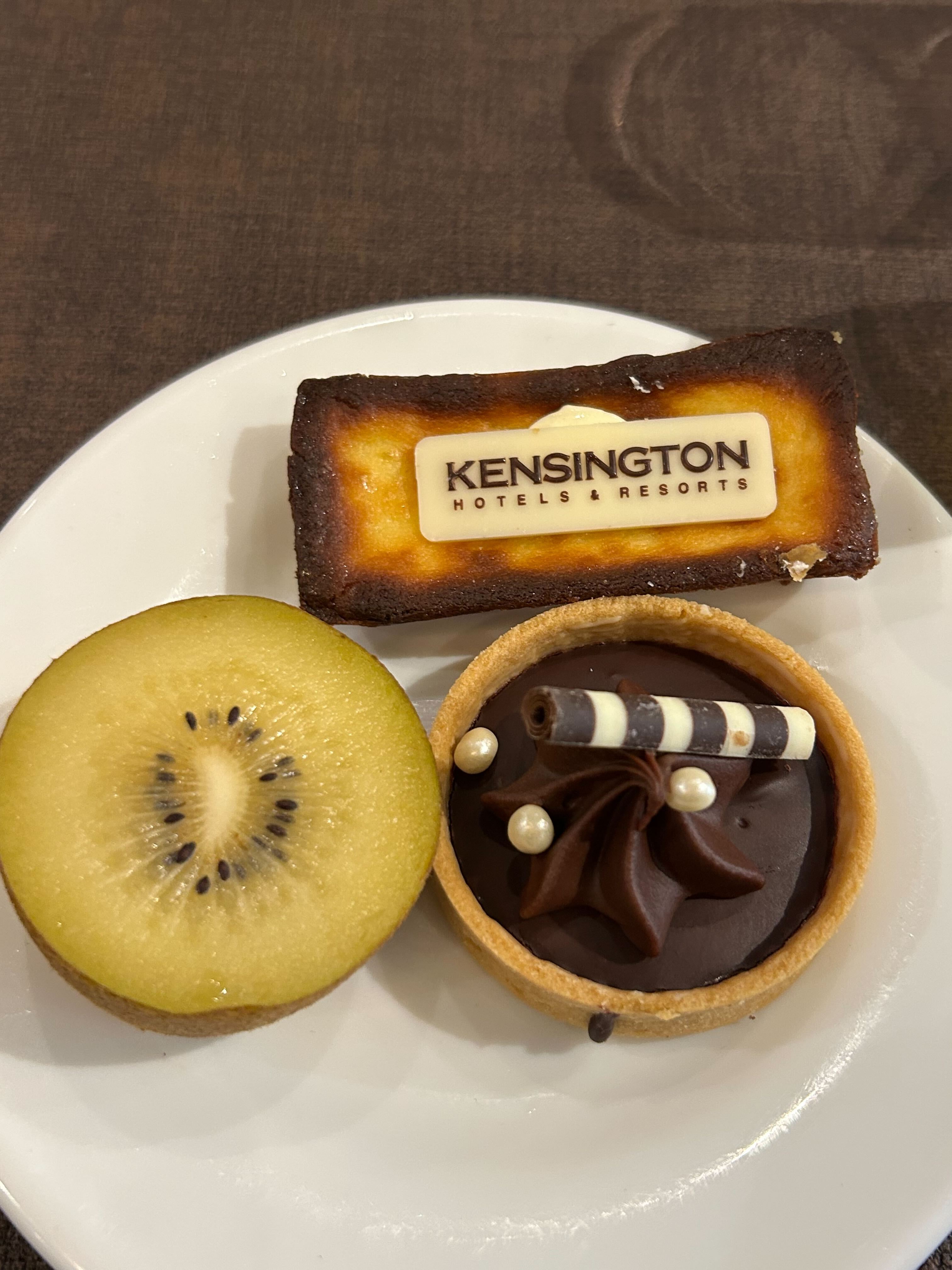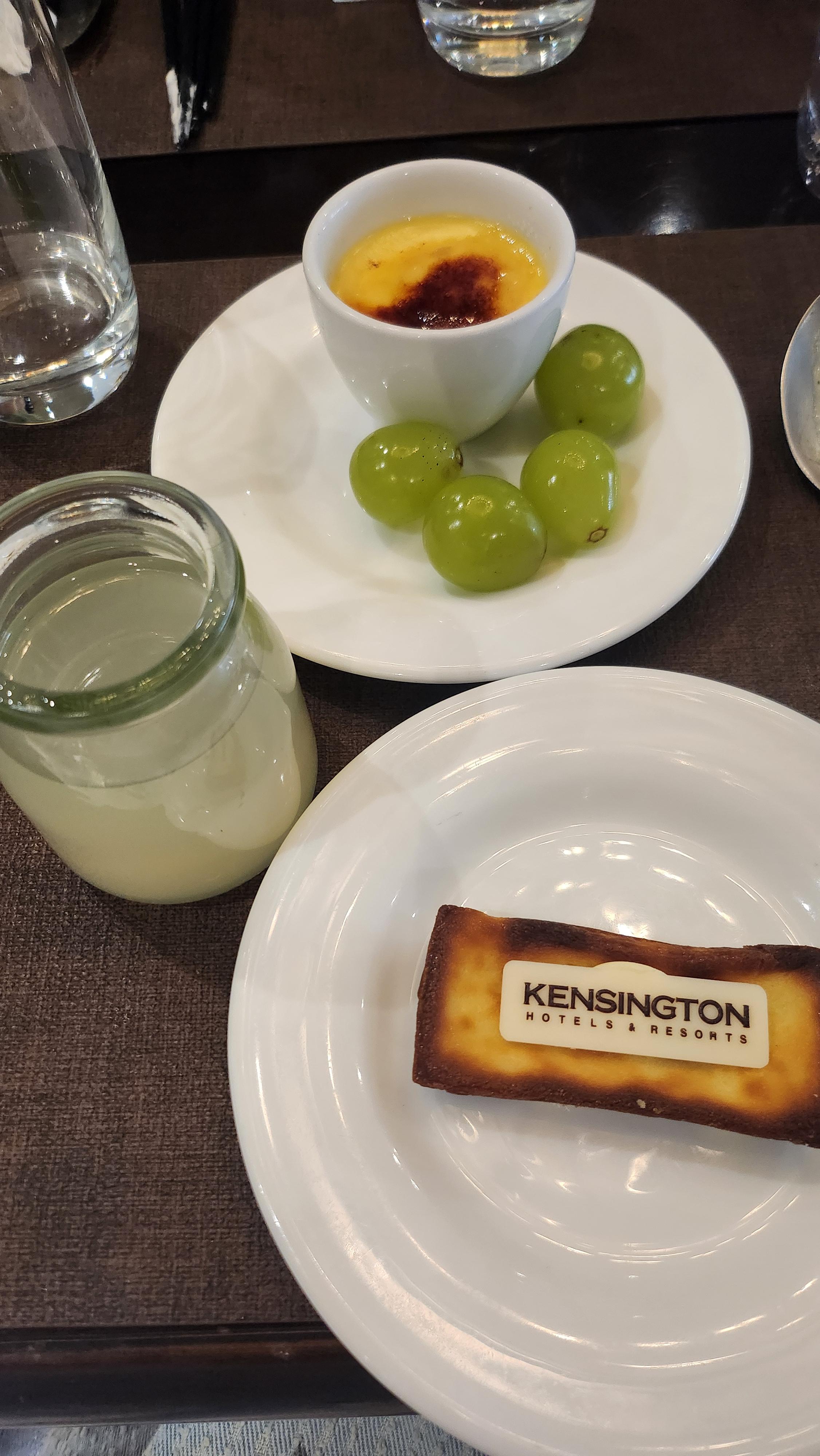 항아리 같은 조그만 접시에 담긴 유자 크림브륄레와 켄싱턴호텔 네이밍이 새겨진 미니 바스크 치즈케이크, 초코슈 그리고 위에 사진에 보이는 점박이는 드래곤후르츠. 아... 디저트 문외한에겐 너무나 외우기 어려운 이름들입니다. 디저트는 호불호 없이 모두 맛있었지만 가장 호응이 좋은 건 역시나 유자 크림브륄레 였어요. 딱딱해진 설탕을 톡톡 깨부수고 한입 먹으면 처음은 달달한 맛이었다가 입에 남는 잔향이 유자의 풍미로 가득 찬다고 해요. 달달한 것도 계속 먹다보면 느끼하고 조금 질리는데, 여기 디저트들은 무한대로 먹을 수 있겠다며ㅎㅎ