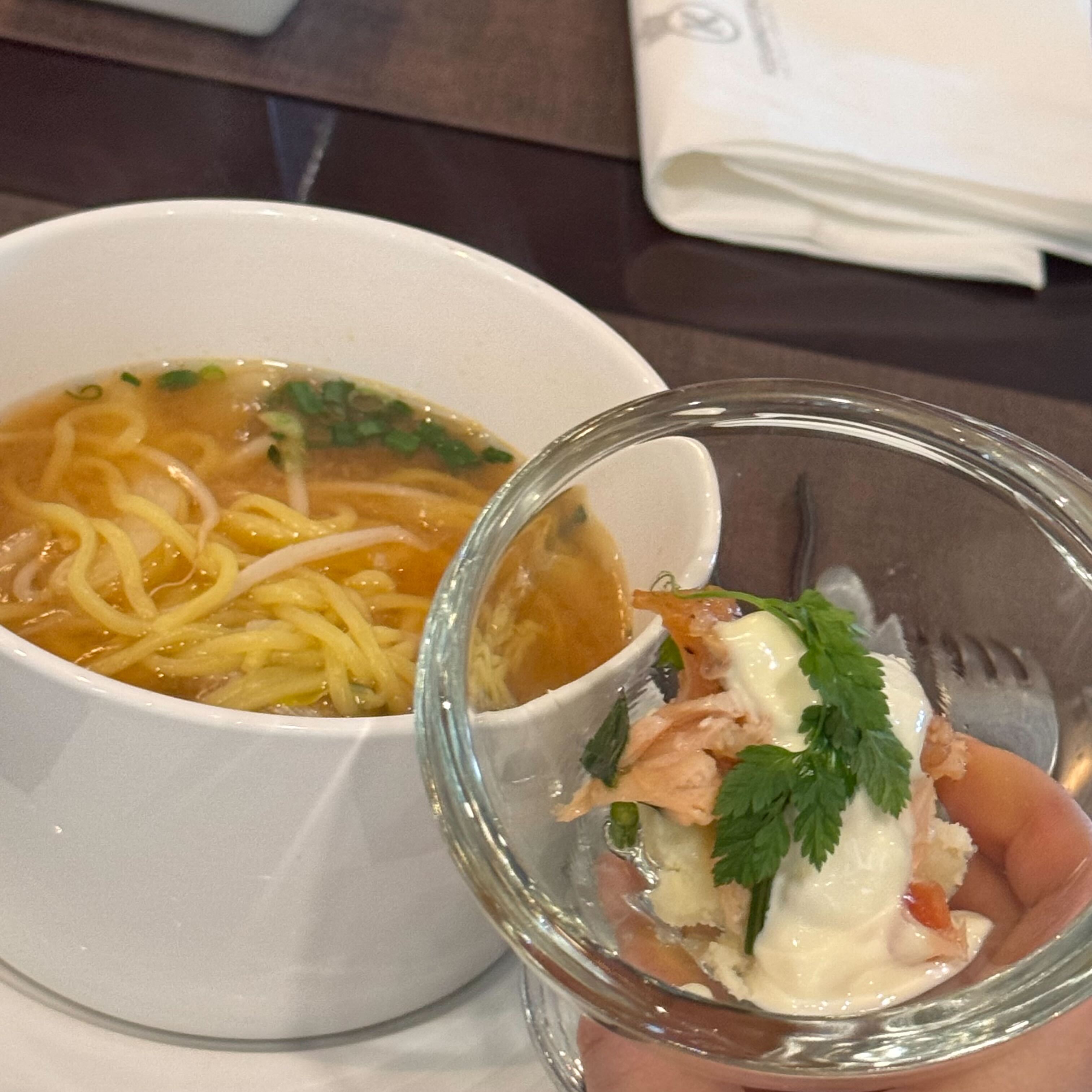 이제 턱관절을 적당히 풀어두었으니 해산물 국수를 먹으러 갑니다. 숙주와 청경채 같은 야채와 새우, 그리고 조갯살을 그릇에 담아 셰프님에게 건네드리면 "면 드릴까요?"라고 물어봐 주십니다. "아유, 국물만 먹는 사람도 있나요? 면 주세요!"라고 요청드리고 40초 정도 기다리면 해산물향 가득한 국수 완성! 시원하고 달큰한 맛이 처음 딱 느껴진 후에 목넘김은 칼칼한데요. 비슷한 타이밍에 저랑 같이 국수를 먹던 동료가 "게국지 맛이랑 비슷해요!"라고 하더군요. 완전 동의했습니다. 면도 쫄깃하고 담백하니 맛있어서 배부를까 걱정하는 분들 아니라면 꼭 국수까지 같이 받아서 한그릇 맛있게 드셔보세요.