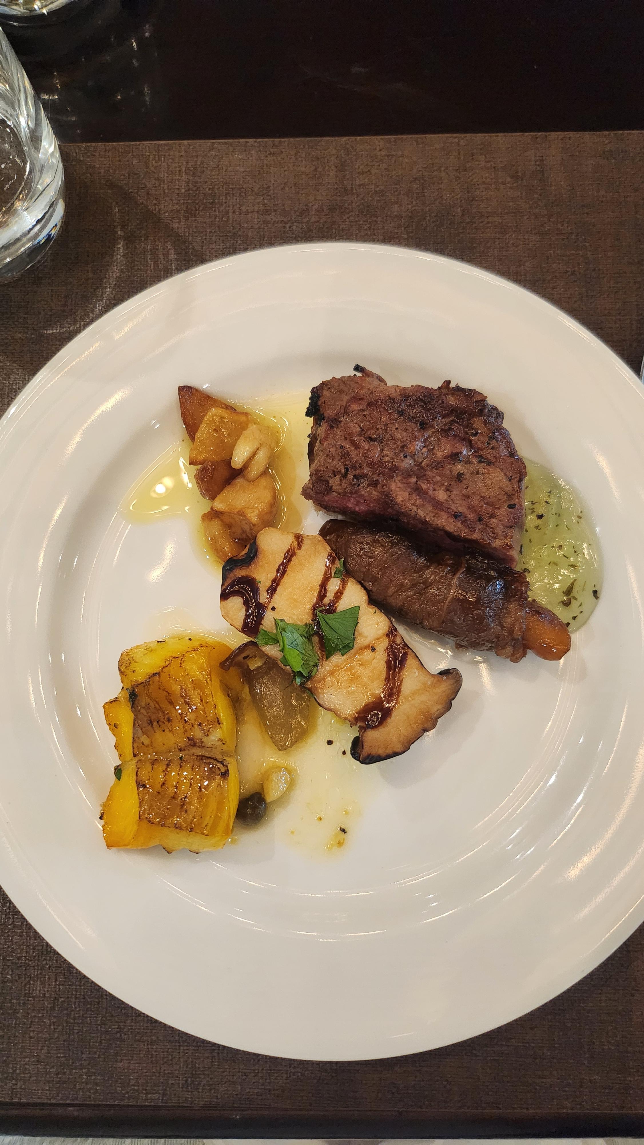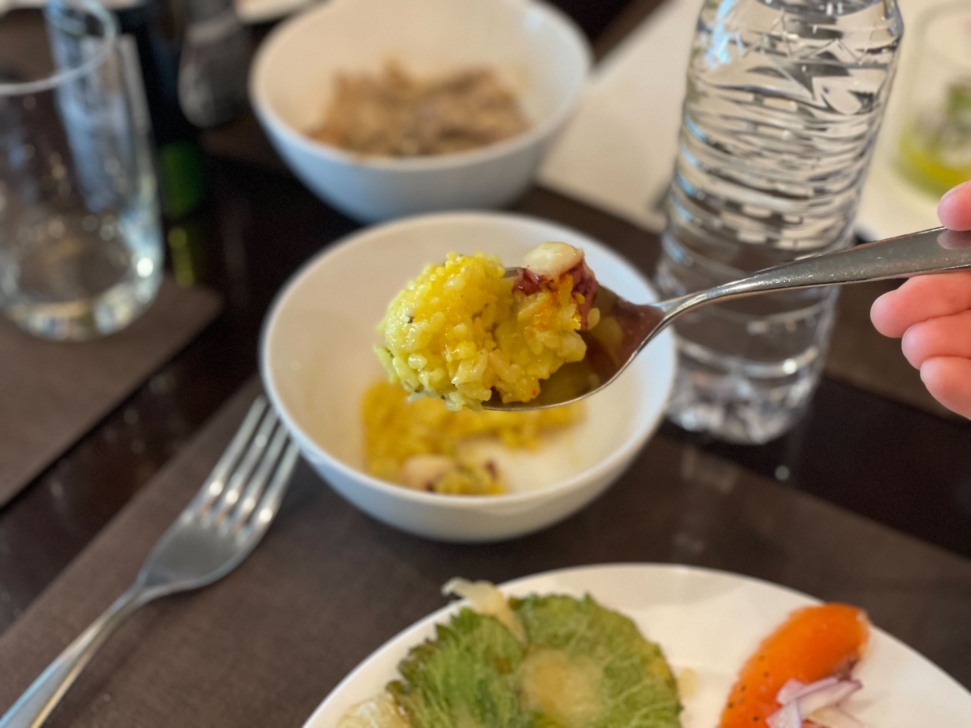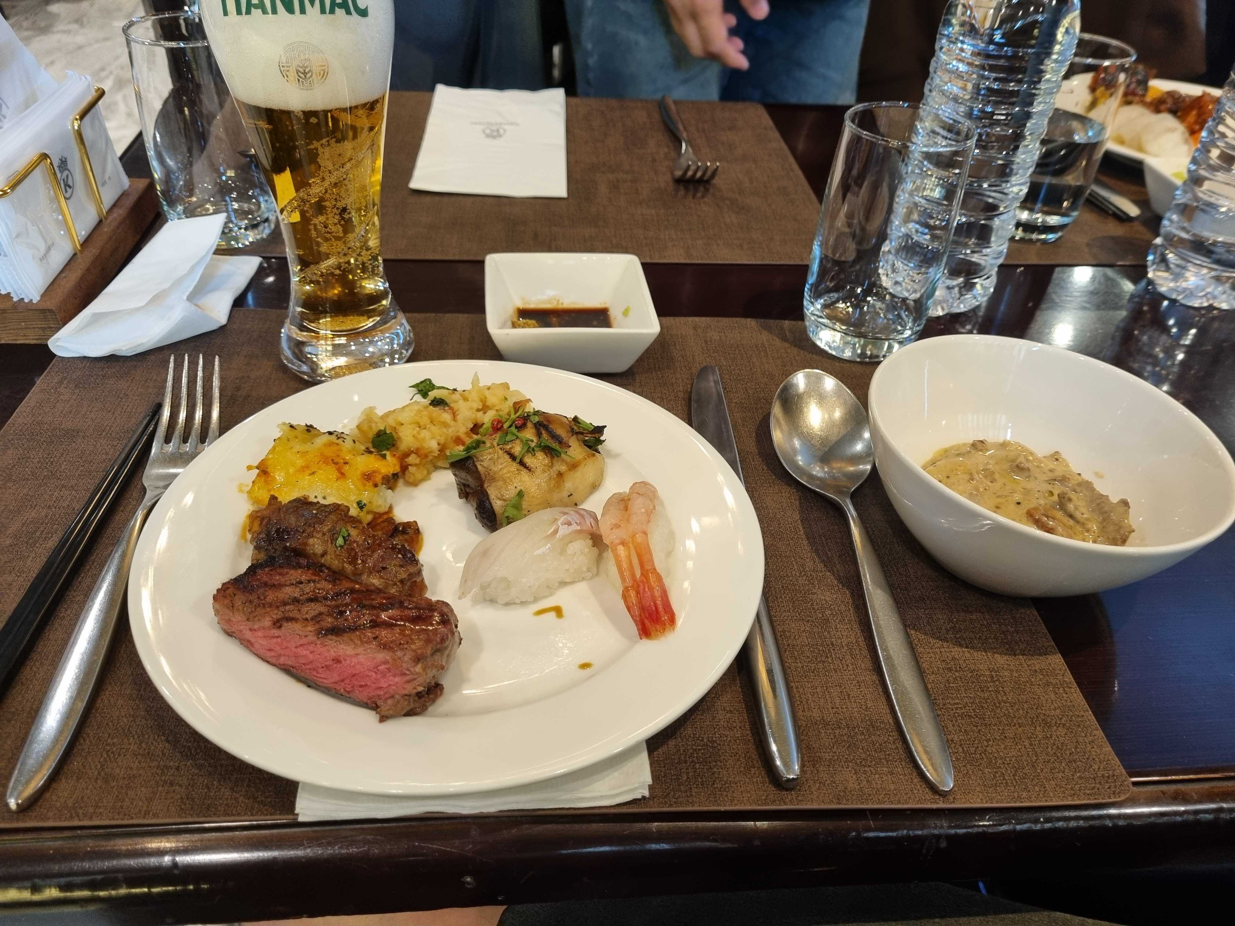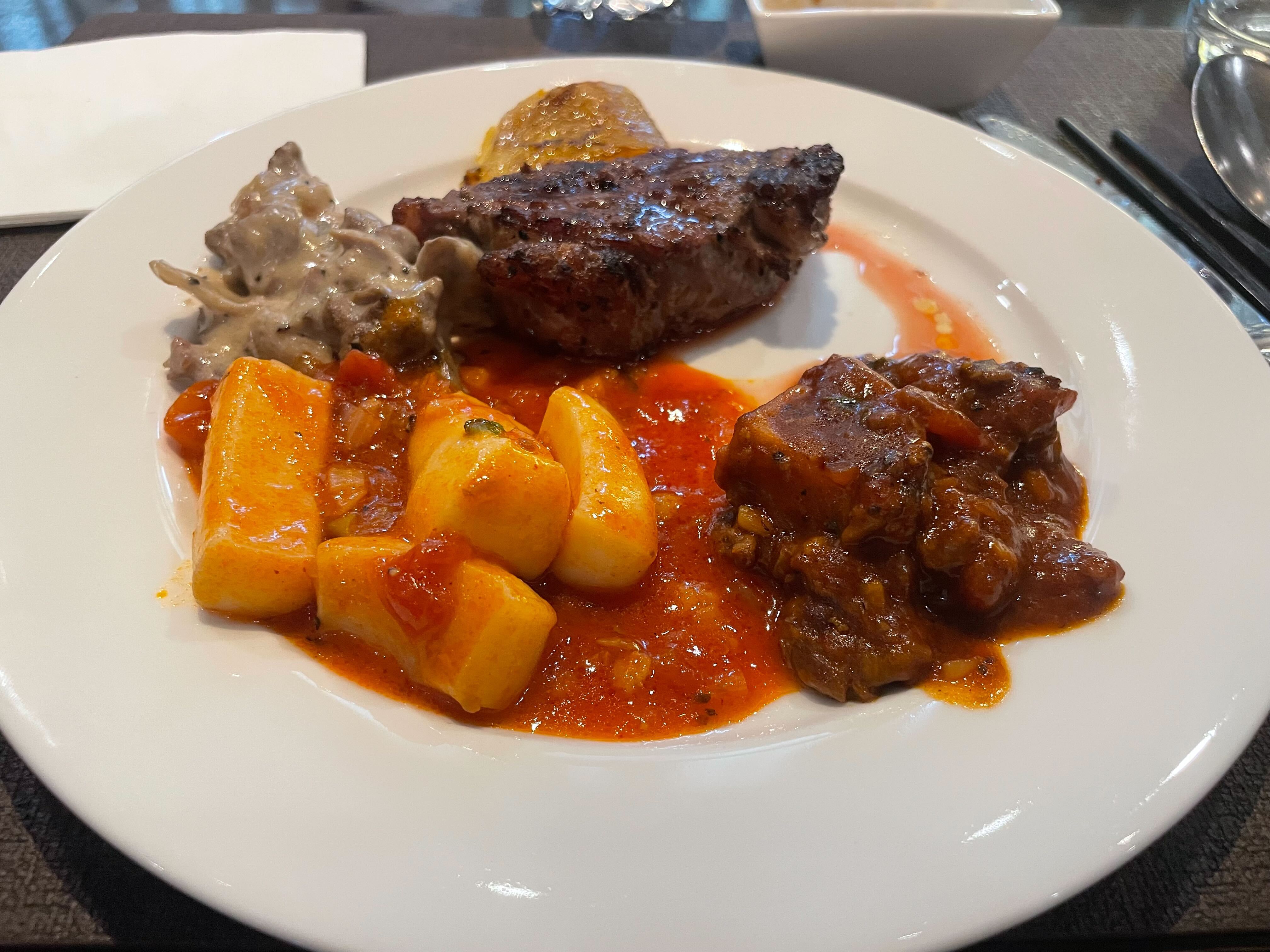 자, 이제 본격적으로 신선한 해산물을 공략해보기로 합니다. 그릴링 코너에 있던 바지락 토마토 스파게티와 봉골레, 문어가 송송 들어간 샤프란 리조토, 전복, 새우 세비체, 단새우 초밥과 농어 초밥이 아주 맛깔스러워 보이네요. 샤프란 리조토는 스프와 스튜 코너에 있었는데, 옆에 있는 비프 굴라쉬도 진짜 맛있었대요! 지금보니 제가 못 먹은 메뉴가 많네요ㅠㅠ 으앙ㅠㅠ 비프 굴라쉬 오늘도 제일 맛있었다고 강조하는 분이 계셔서, 사진 잠깐 보고 다시 해산물 얘기 나눠보겠습니다.
