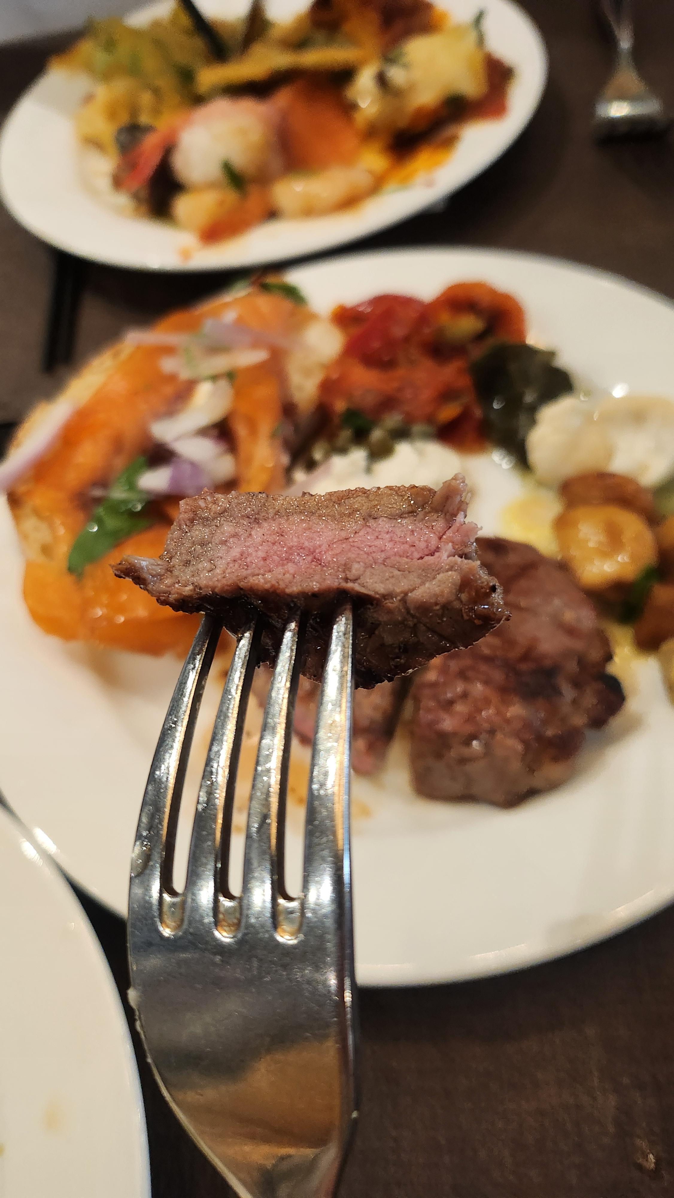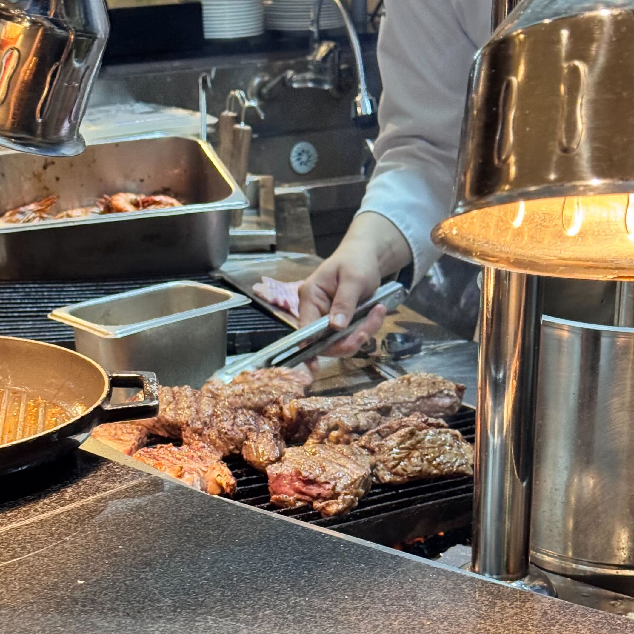 브로드웨이 뷔페 후기를 찾아보면서 양갈비가 그렇게 맛있다는 얘길 듣고 기대를 많이 했었는데요. 아마 디너 코스에 포함된 것 같습니다. 저희가 찾은 날은 런치 타임이라, 채끝 등심만 준비되어 있었어요. 근데 소스로는 민트젤리도 준비되어 있더라구요. 방금 지글지글 구워진 채끝 등심 두 덩이를 받아들고 민트젤리 조금이랑 구운 마늘, 버섯을 받아와서 코스요리처럼 천천히 음미해봅니다(안찍었지만 아스파라거스 5줄기 더 먹었습니다). 사진으로 확인하니 대하구이도 많이들 받아오셨네요. 저는 까먹는 게 귀찮아서 가볍게 패스했지만 저 불향으로 함께 구워졌다면 뭐든 맛있었으리라 짐작해봅니다.