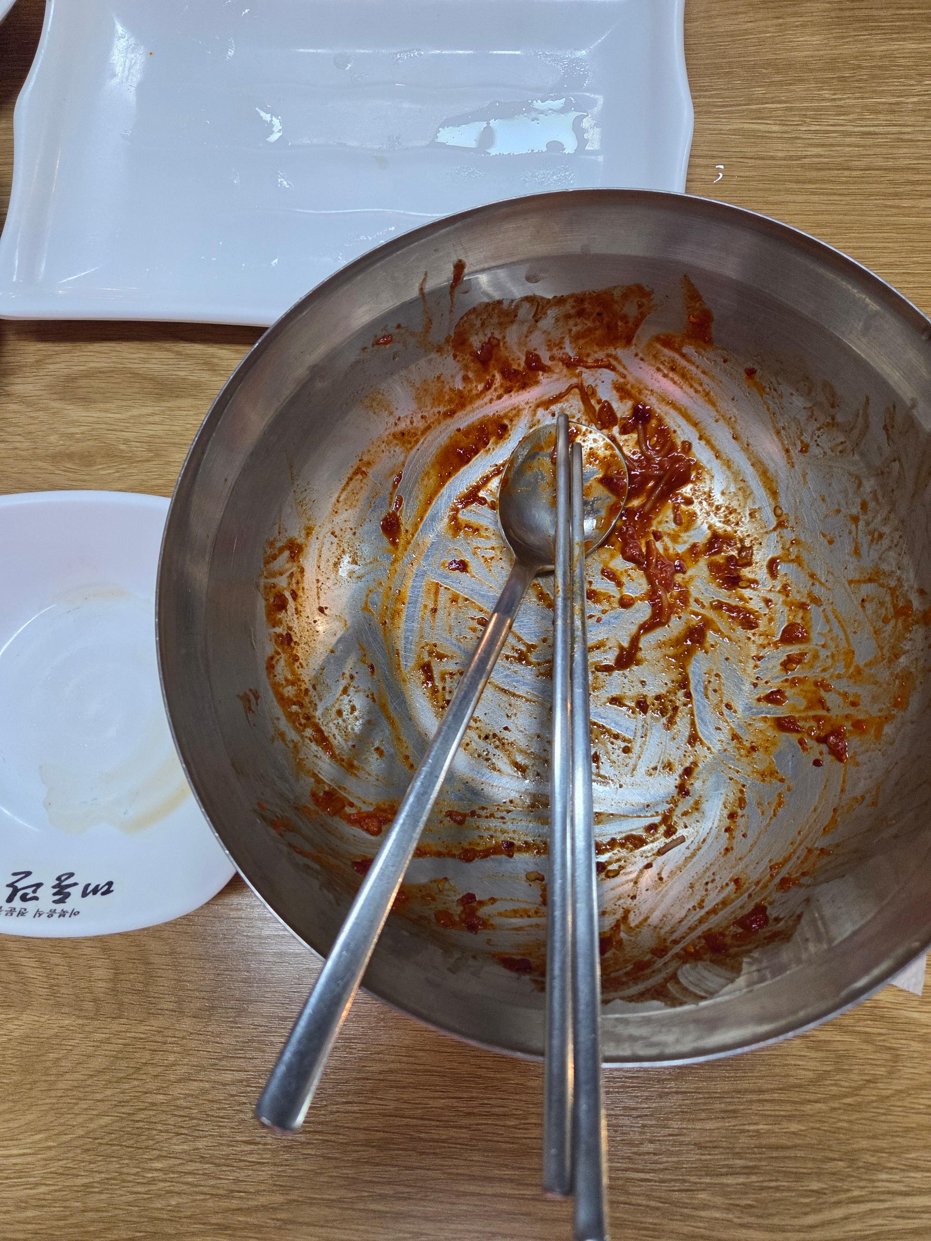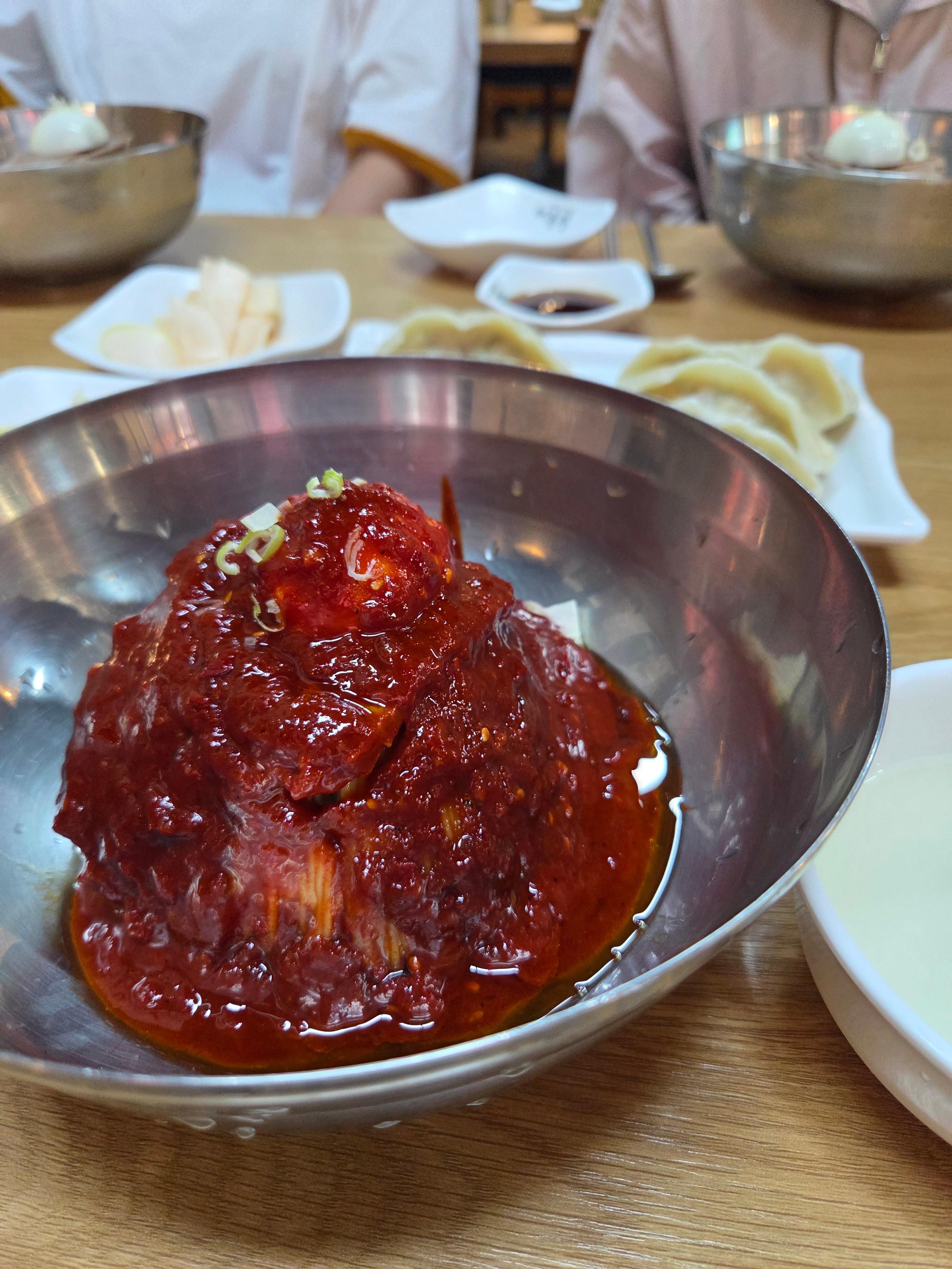 살얼음은 없지만 그래도 꽤 시원했다는 물냉 후기. 사골 잠깐 담궜다가 빼낸 듯한 초상급자용 평냉이 아니라, 적당히 깊은 육수의 맛이 우러난 국물입니다. 저는 맑은 국물은 지리매운탕만 허용하는지라 제 앞에 딸기 빙수처럼 놓인 비냉을 촵촵 비벼봅니다. 제가 잠깐 나간 사이에 주방장님이 직접 서빙을 해주시며 식초나 겨자 간을 아무것도 하지 않고 첫입은 먹어보라고 하셨대요. 근데 첫입 먹고나서 아무도 소스통에 손 안갖다 댔습니다. 함께 주문한 접시 만두는 두부가 가득한 정통 북한 느낌이었지만 숙주가 좀 오래 스팀을 맞아서인지 살짝 누린내가 났어요. 그래도 냉면이 워낙 맛있으니까 봐주기로 합니다. 양 엄청 많았는데, 계란까지 싹 다 먹음!