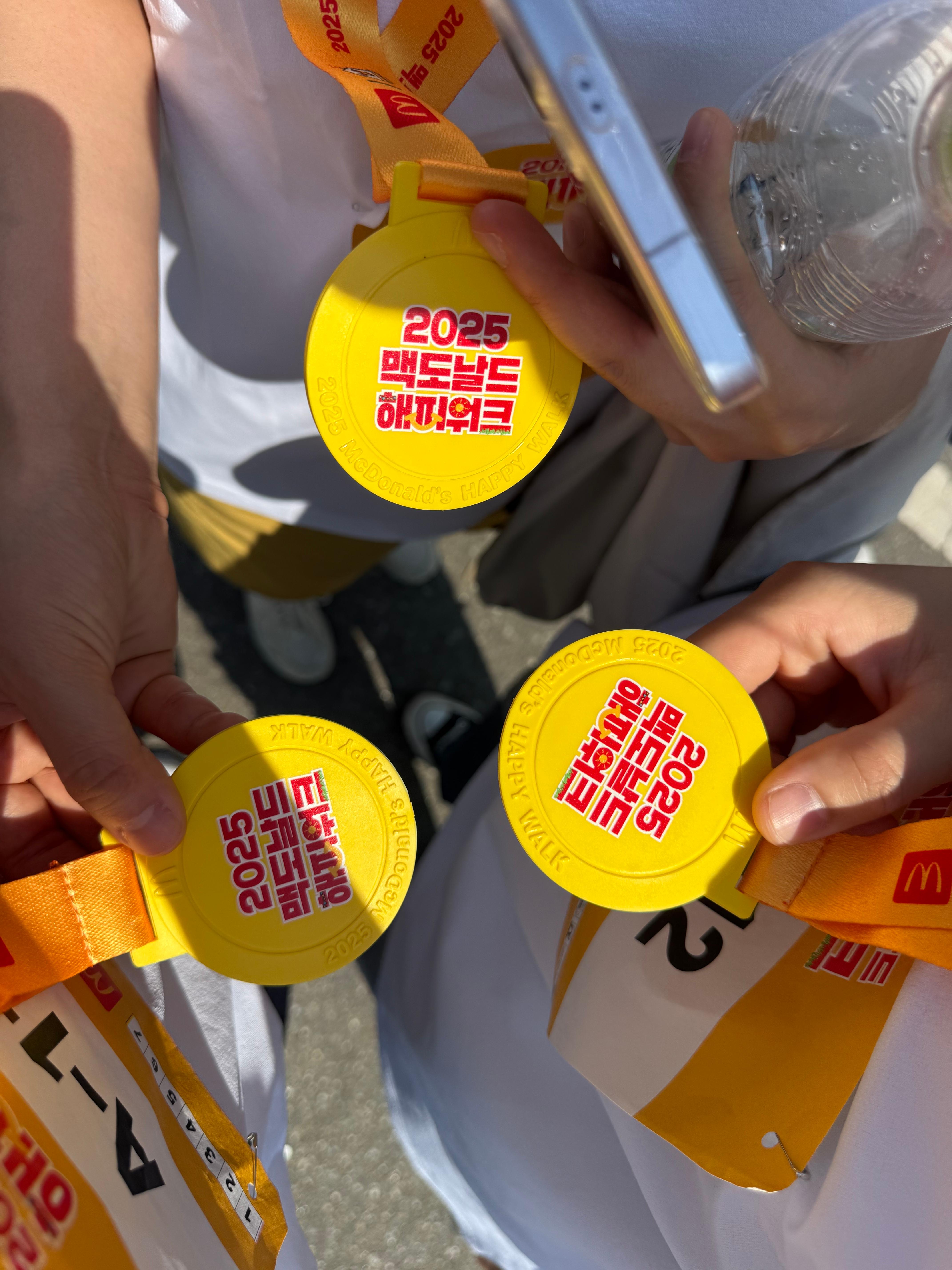 자, 골~인! 해피워크 완주를 축하합니다 짝짝짝! 샛노란 완주 메달도 목에 걸어봅니다. 뿌우듯!!!