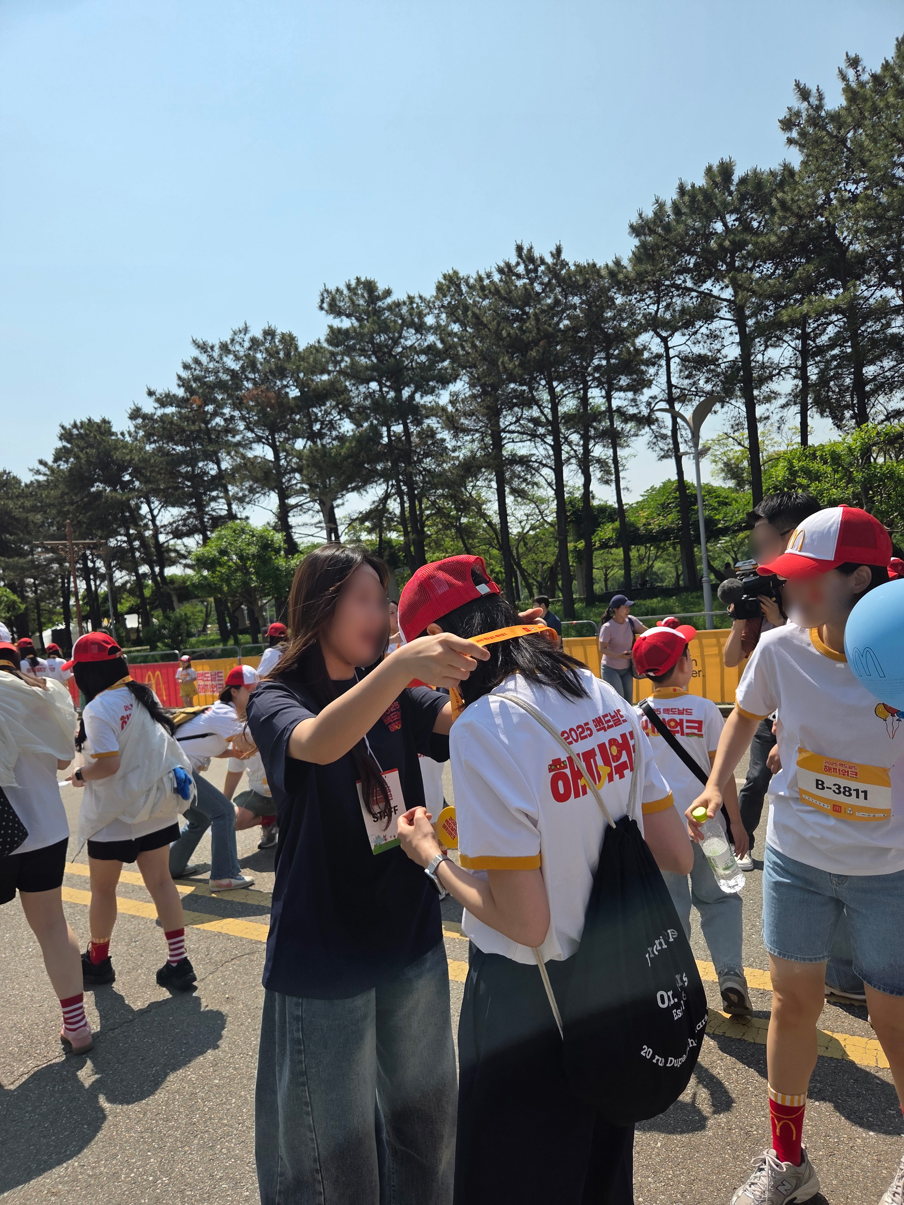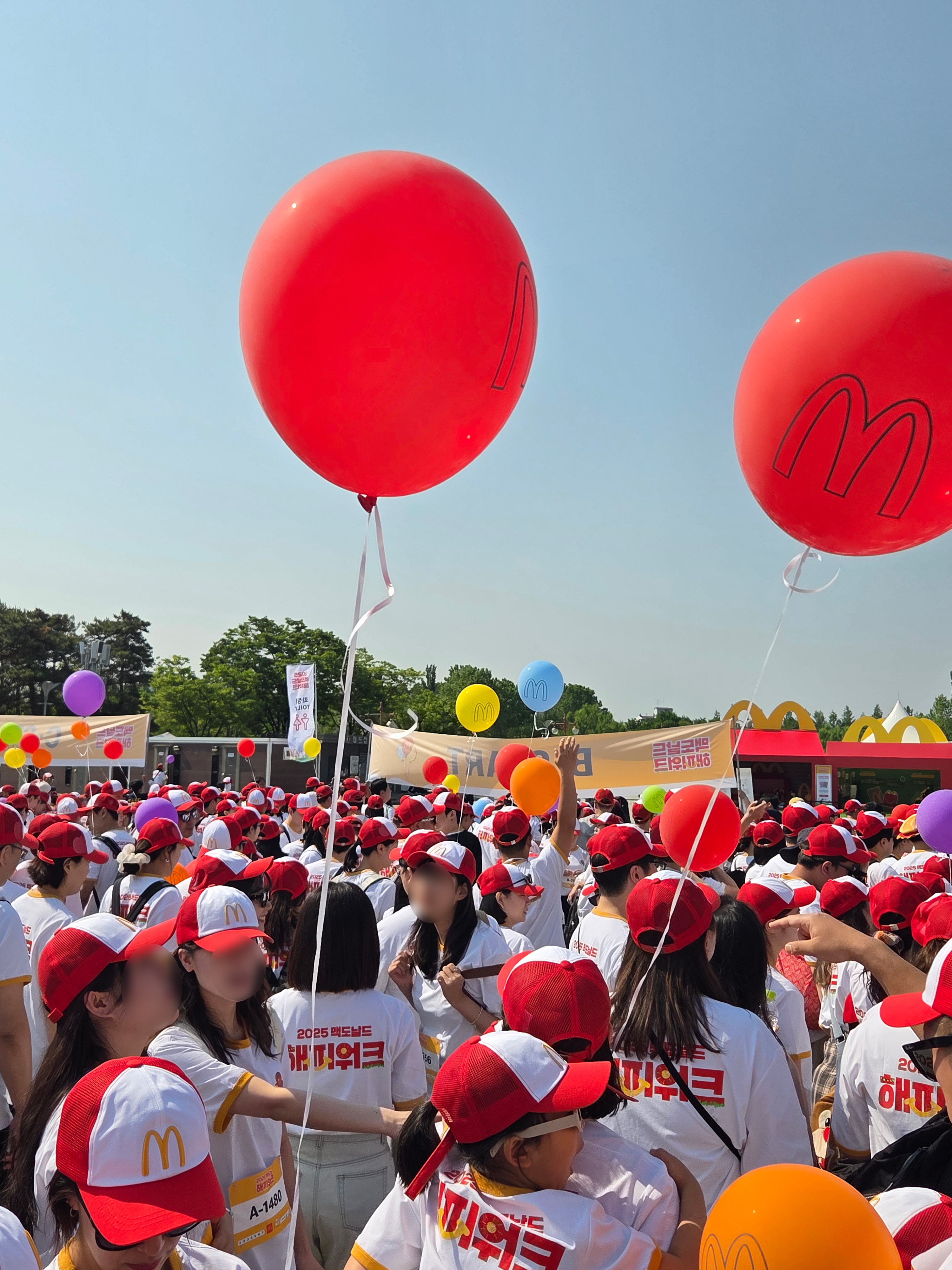 저는 마라톤 대회에서 결코 넘지 않았던 바리게이트를 지나 팀원들과 함께 출발선상에 섰습니다. 맥도날드 저 로고를 골든 아치라고 부른대요. 풍선으로 불어놓으니 더 빵빵하고 귀여워보이죠? 마라톤과는 달리 흔한 호각소리, 출발탄 소리 하나 없이 구호로 외쳐봅니다.