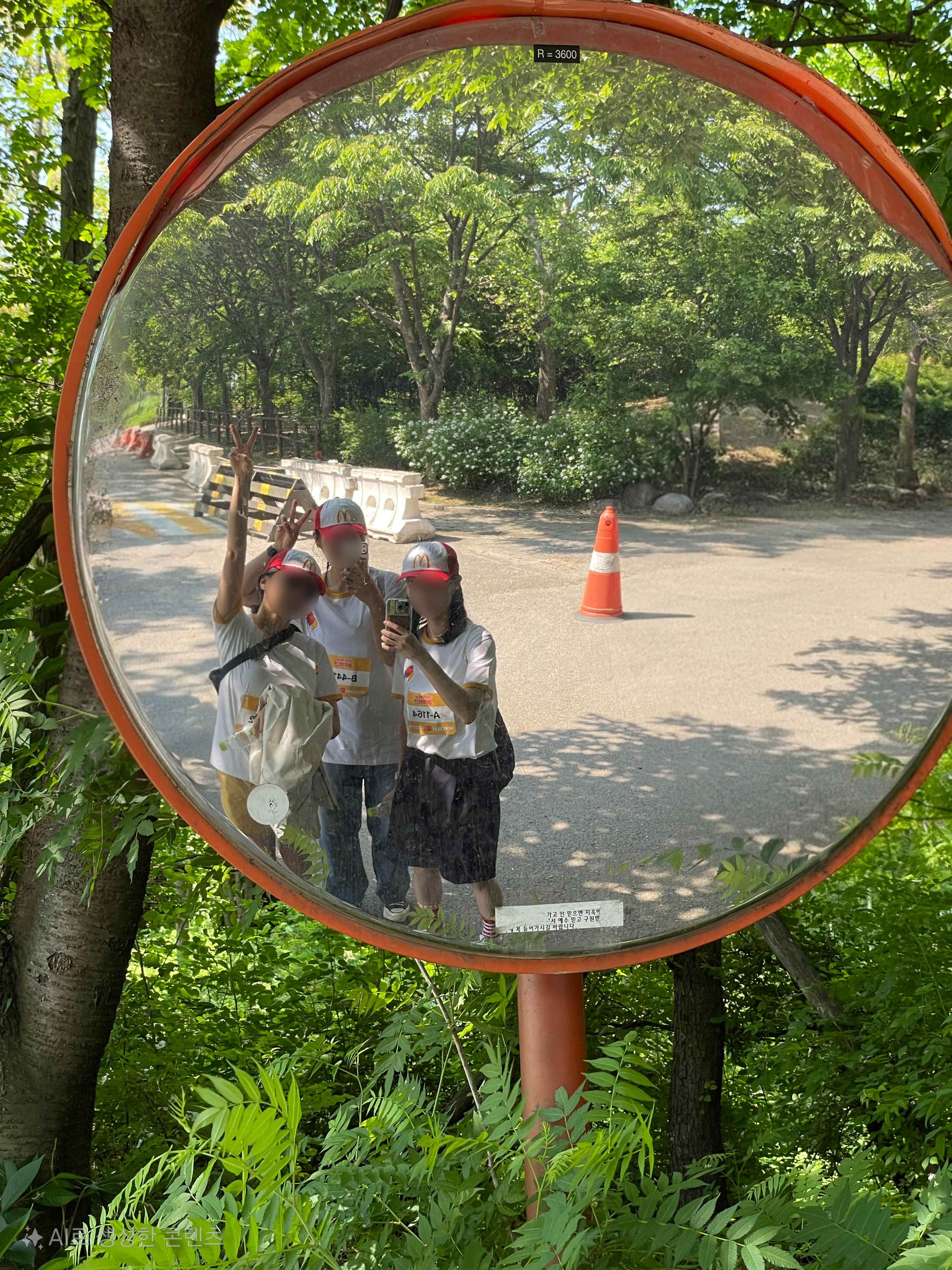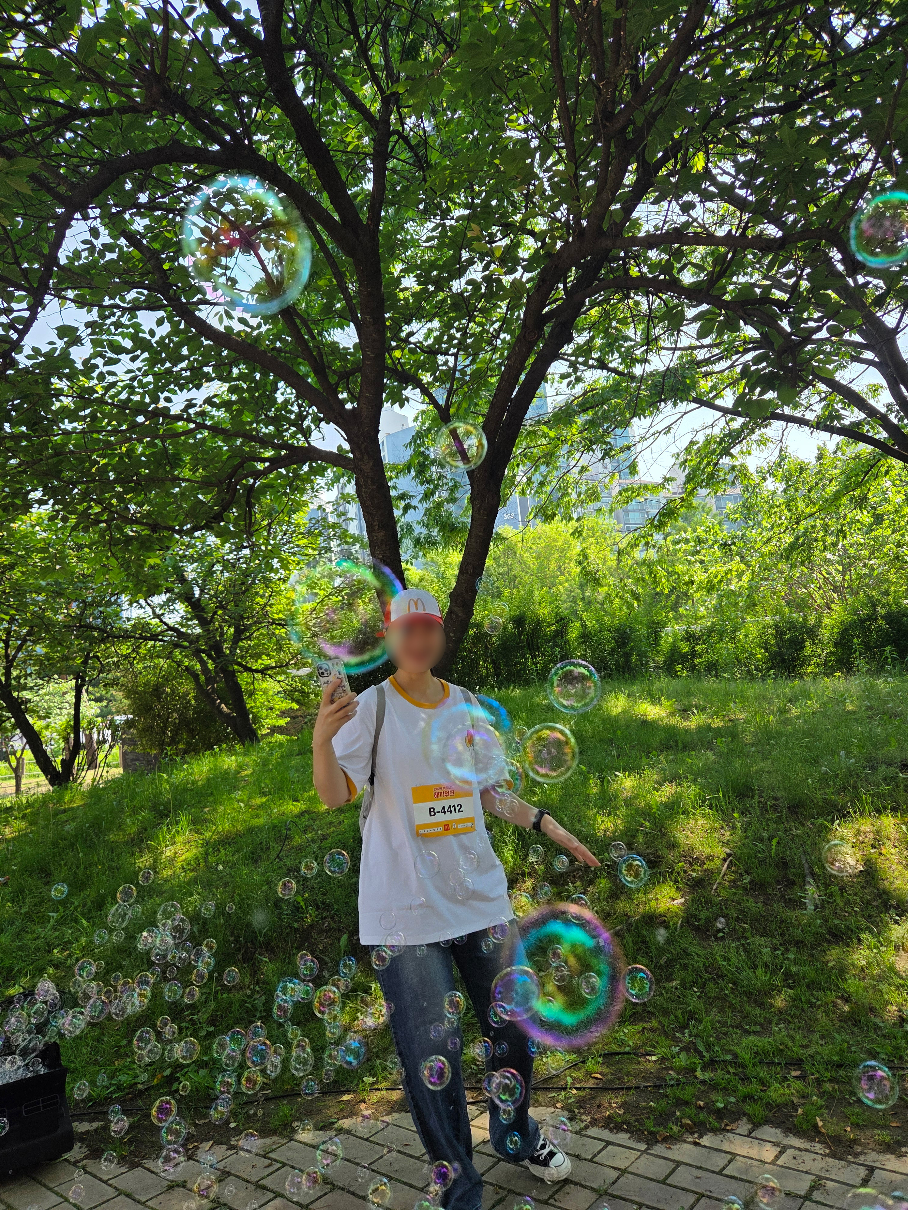 아름드리 나무들이 가지를 뻗어 햇빛을 가려주는 초록 터널에는 비눗방울이 쏟아져 나옵니다. 버블존이래요. 동심 가득 어린 애들처럼 비눗방울을 후후 불면서 1km도 남지 않았다는 소식을 전해듣습니다.