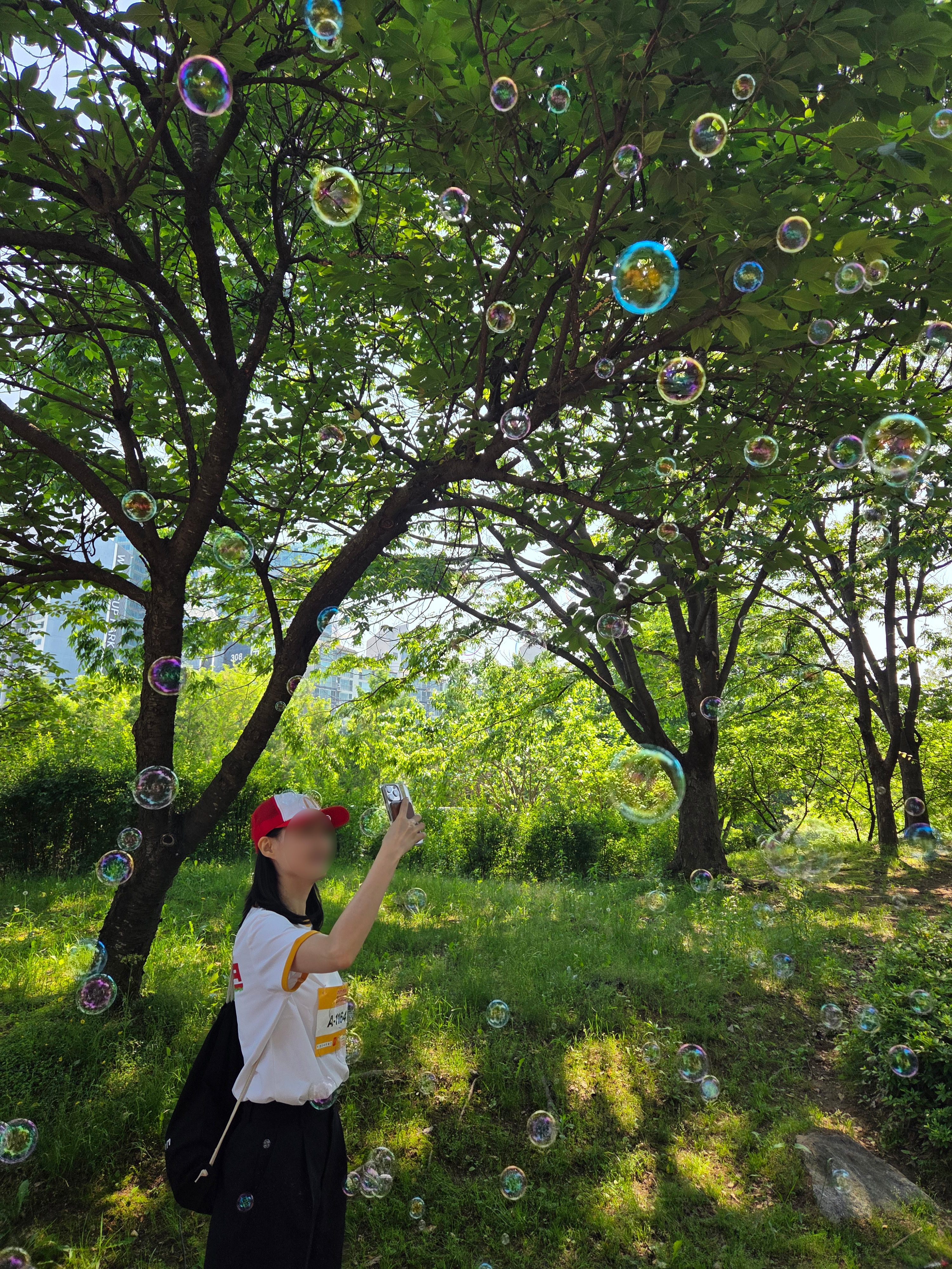 아름드리 나무들이 가지를 뻗어 햇빛을 가려주는 초록 터널에는 비눗방울이 쏟아져 나옵니다. 버블존이래요. 동심 가득 어린 애들처럼 비눗방울을 후후 불면서 1km도 남지 않았다는 소식을 전해듣습니다.