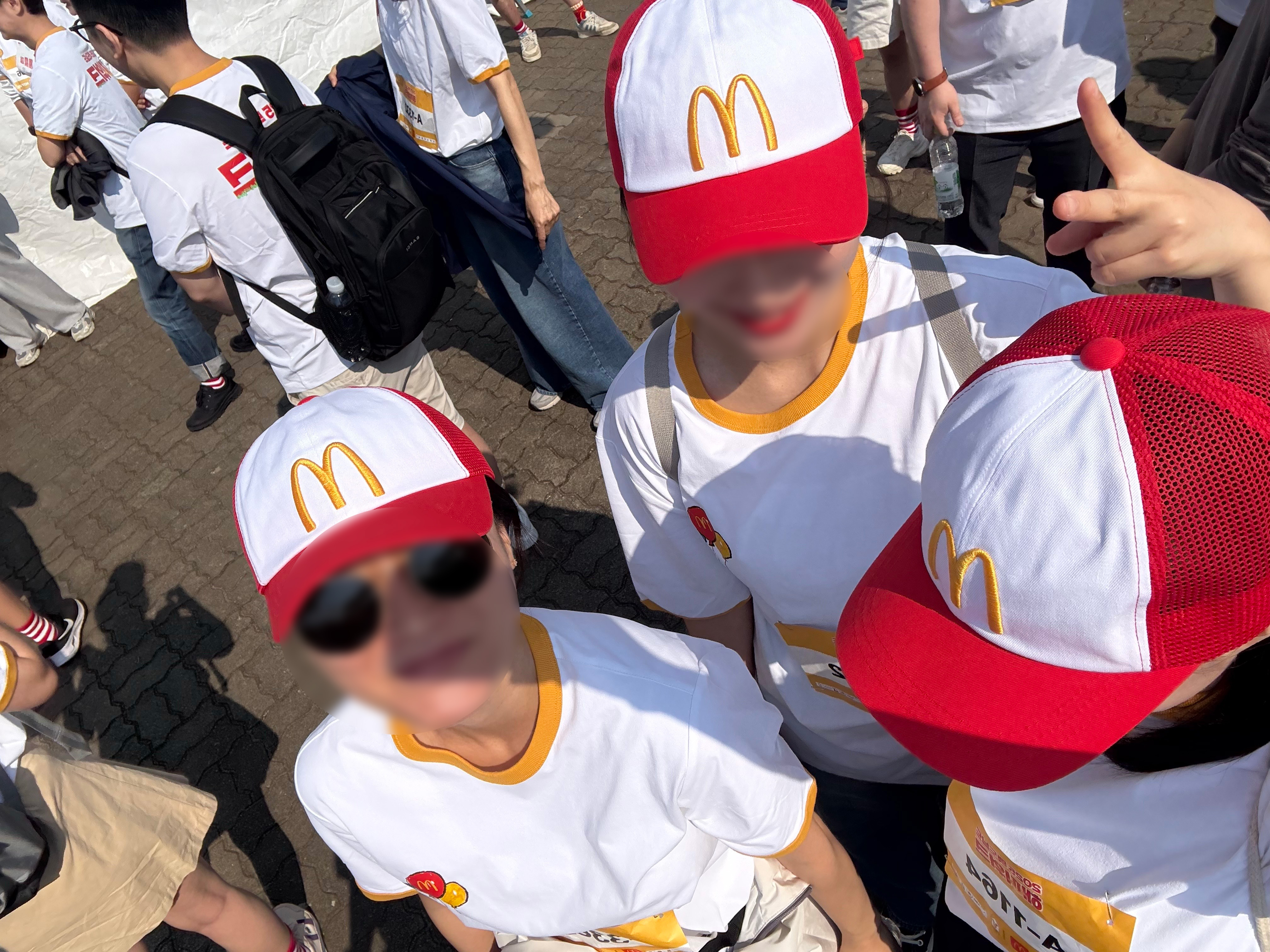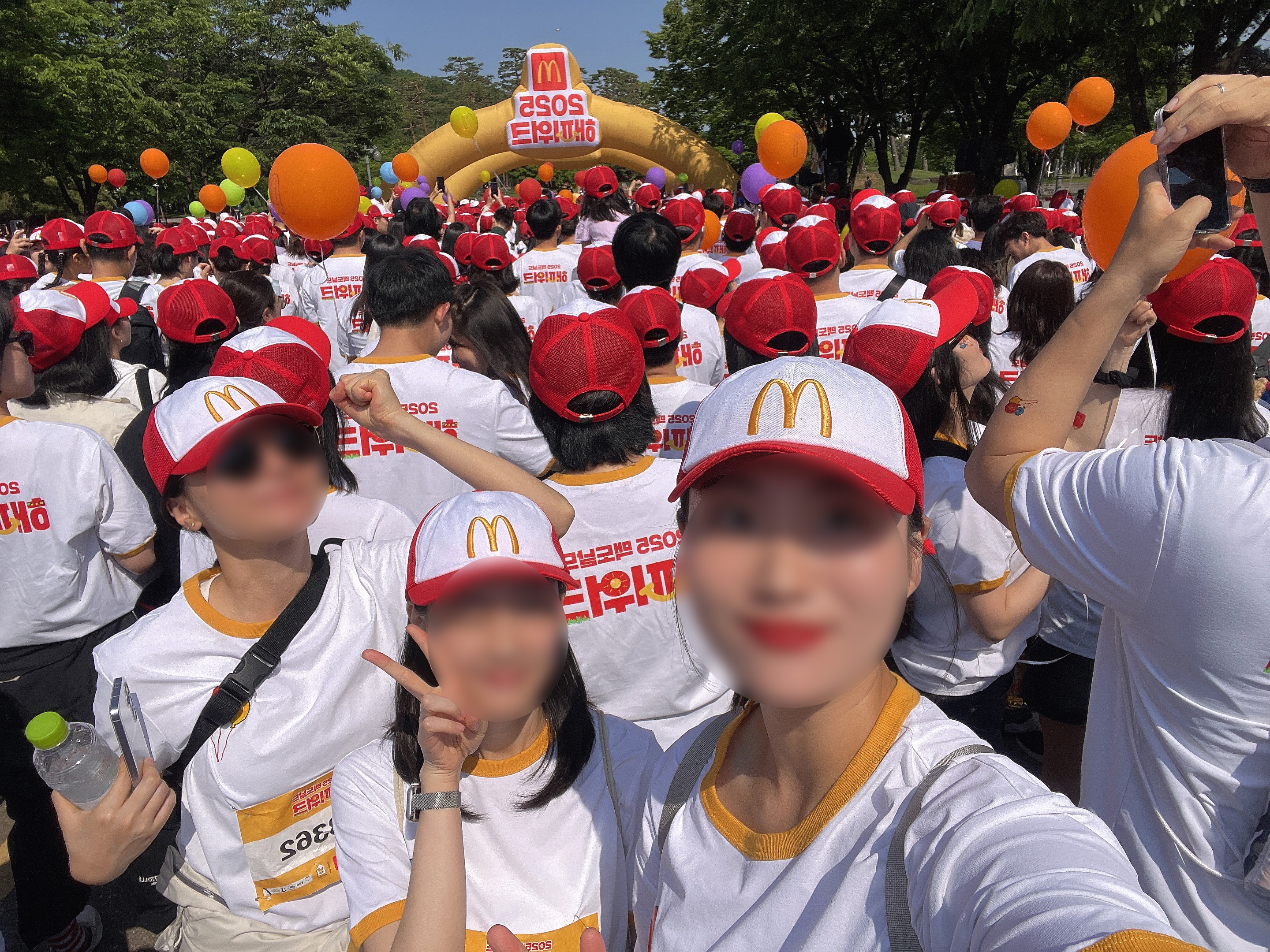 저는 마라톤 대회에서 결코 넘지 않았던 바리게이트를 지나 팀원들과 함께 출발선상에 섰습니다. 맥도날드 저 로고를 골든 아치라고 부른대요. 풍선으로 불어놓으니 더 빵빵하고 귀여워보이죠? 마라톤과는 달리 흔한 호각소리, 출발탄 소리 하나 없이 구호로 외쳐봅니다.