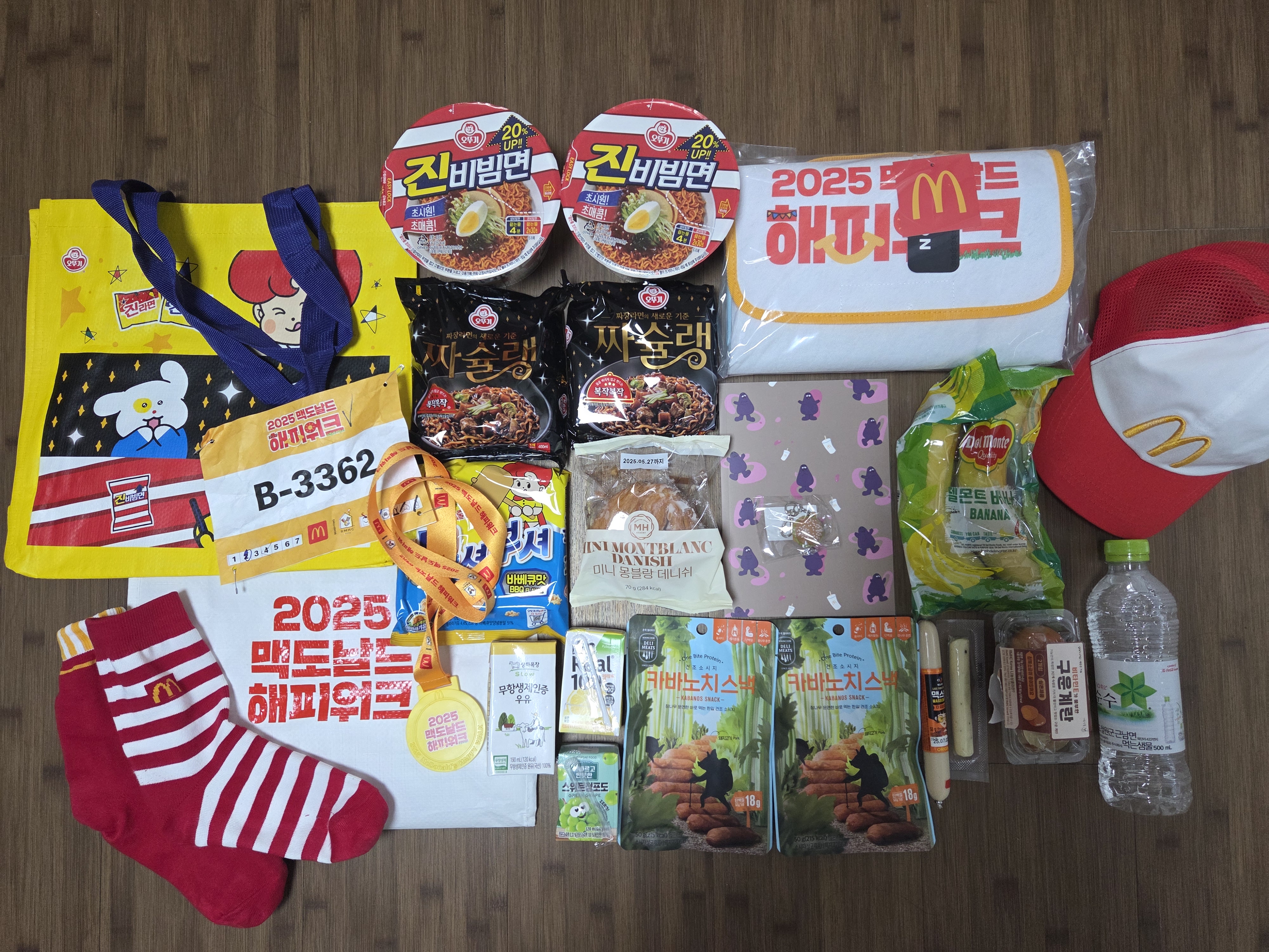 이제 간식부스에서 간식꾸러미를 받고 각 협찬사 부스에 들러 추가 굿즈를 모아보도록 하겠습니다. 와 근데 줄 진짜 길어요... 이쯤되니 출발을 서두를 게 아니라 다들 출발했을 때 20분쯤 대기하고 있다가 부스부터 돌았어야한다는 생각이... 뇌리를 쎄게 스쳤지만... 이미 늦었다잉. 무한대기의 굴레를 지나 인스타 팔로우며 룰렛, 모래주머니 던지기를 모두 수행하고 경품을 이만큼이나 모았습니다.