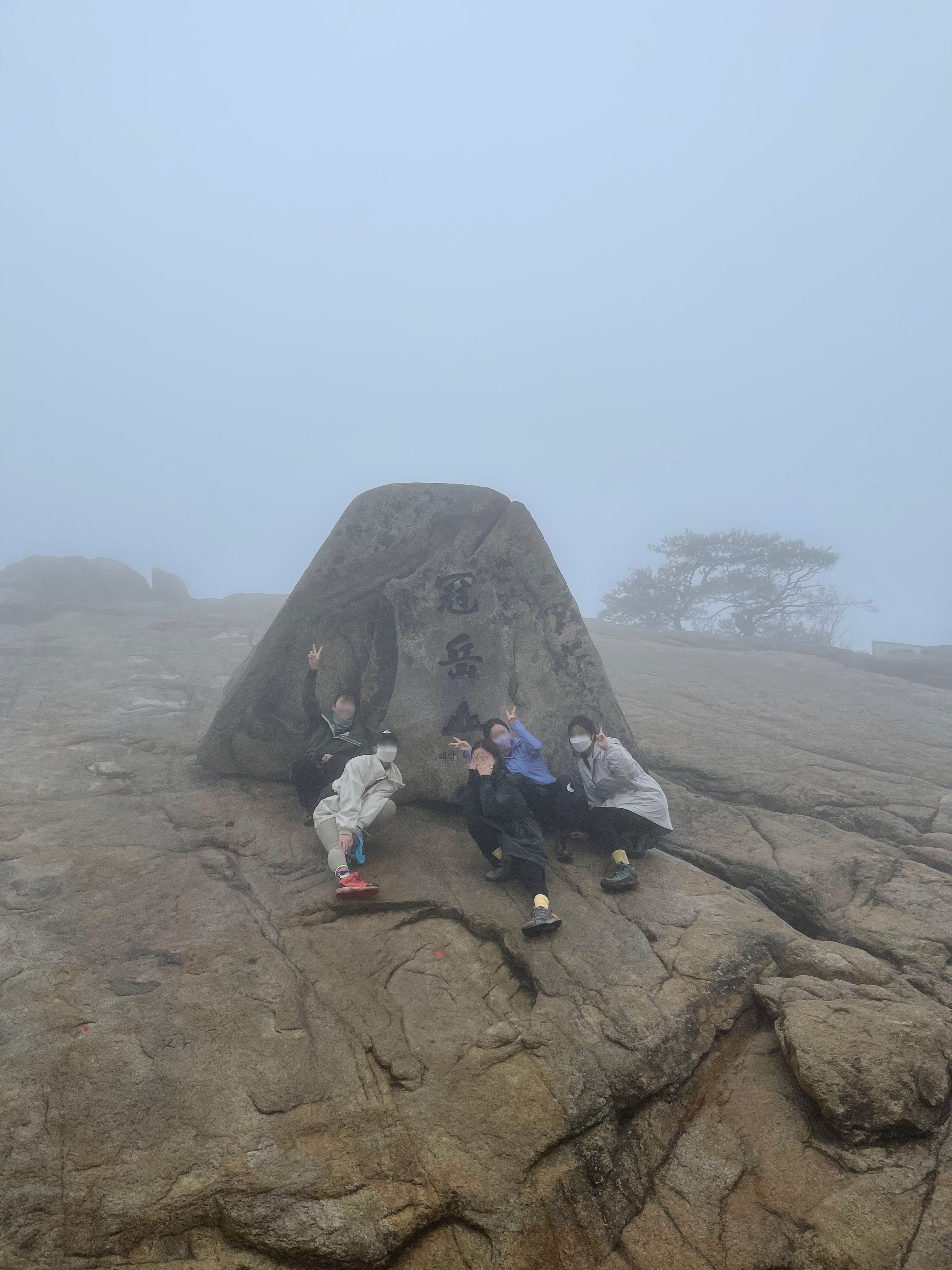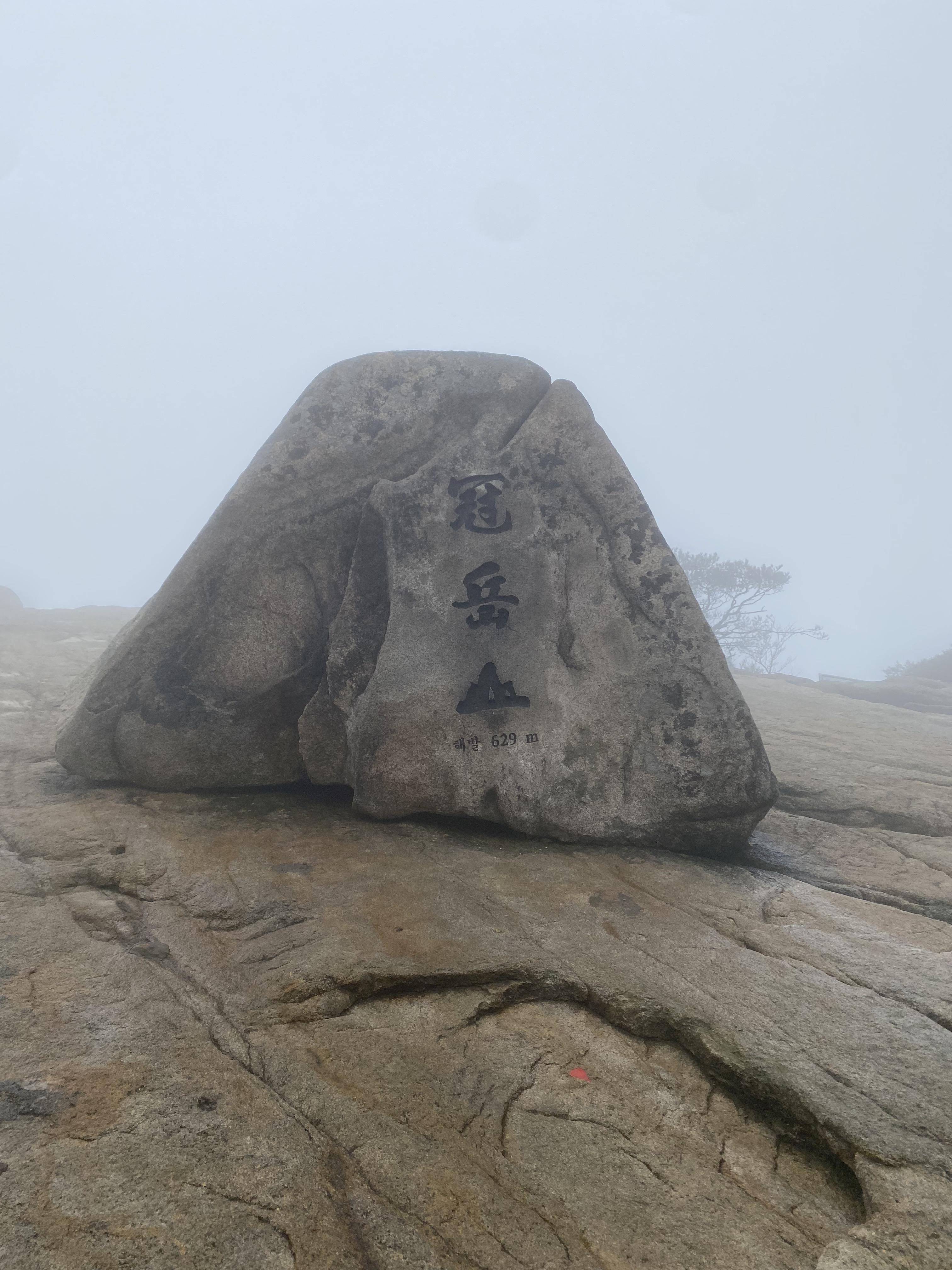 그래서 저희는 해발 629m의 관악산 정상을 찍었습니다. 악산은 오르는 게 아니라고 누가 그랬던가요. 5분만 더 가면 정상이라는 거짓말에 속아 움직이지 않는 다리를 꾸역꾸역 옮기며 도착한 그 곳은 희뿌연 안개에 다소 신비로웠지만 그 성취감은 말로 하지 못할 것 같아요. 이래서 사람들이 등산하는구나, 조금 이해도 되었습니다. 아, 그리고 생각보다 저기서 사진찍는 게 되게 어렵더라구요. 사진에서 오른쪽 바위에 딛는 곳이 아주 미세하게 찍혀있는 데 저 날씨처럼 비가 촉촉히 온 날은 더 조심하셔야할 것 같아요. 운동신경이 없는 저는 혹시나 앞으로 고꾸라질까해서 괴성을 질렀던 기억이 납니다.
