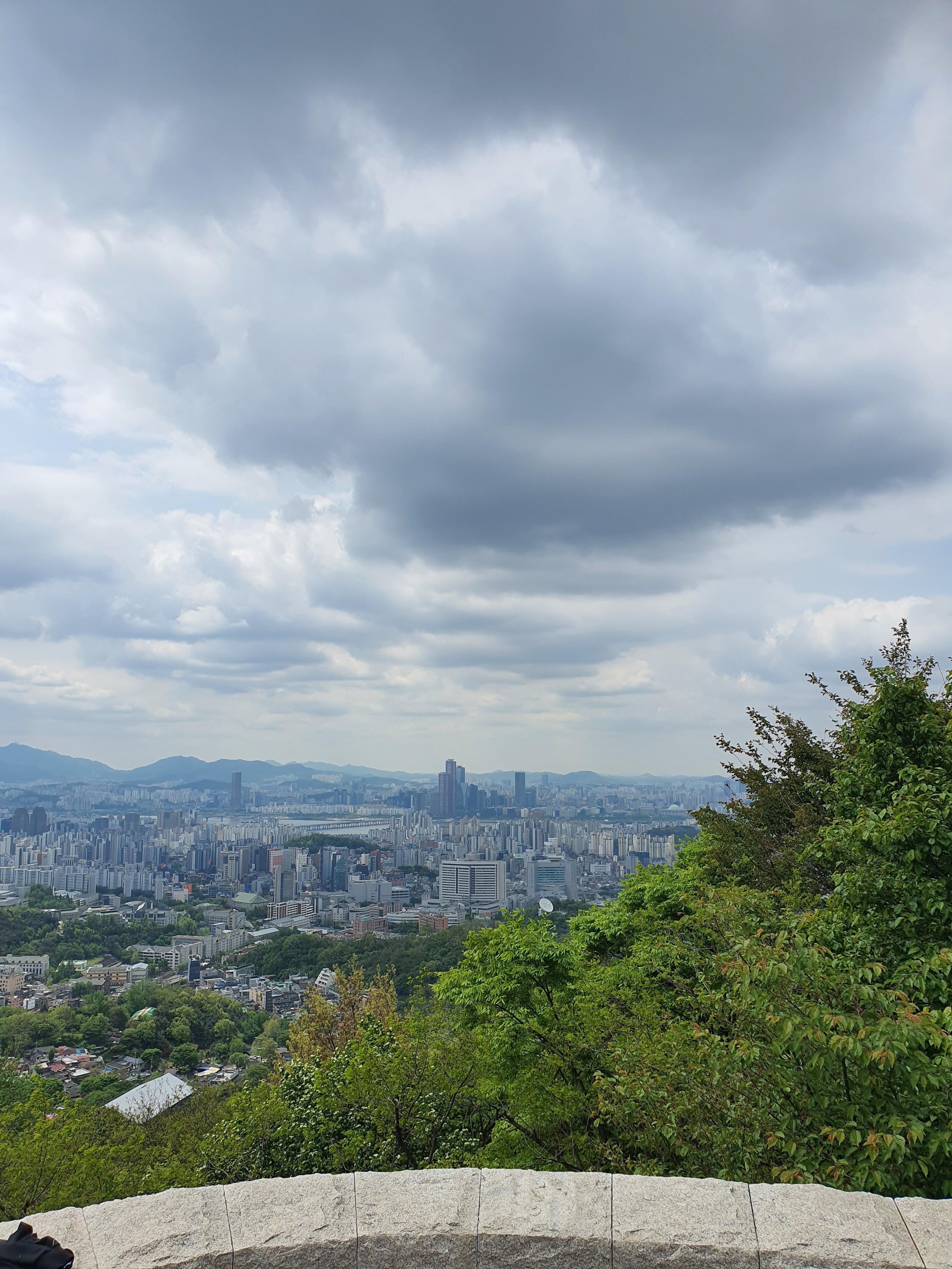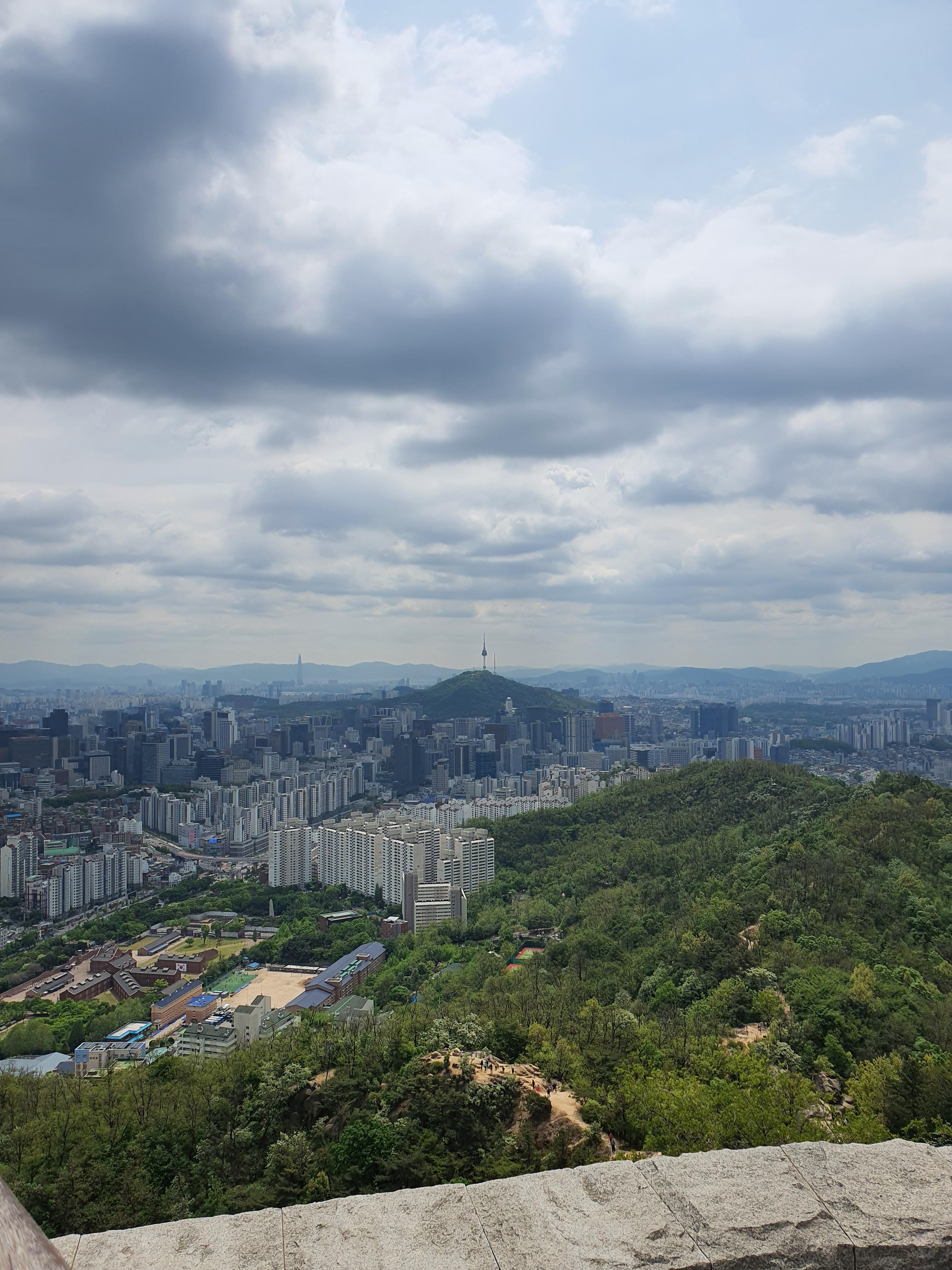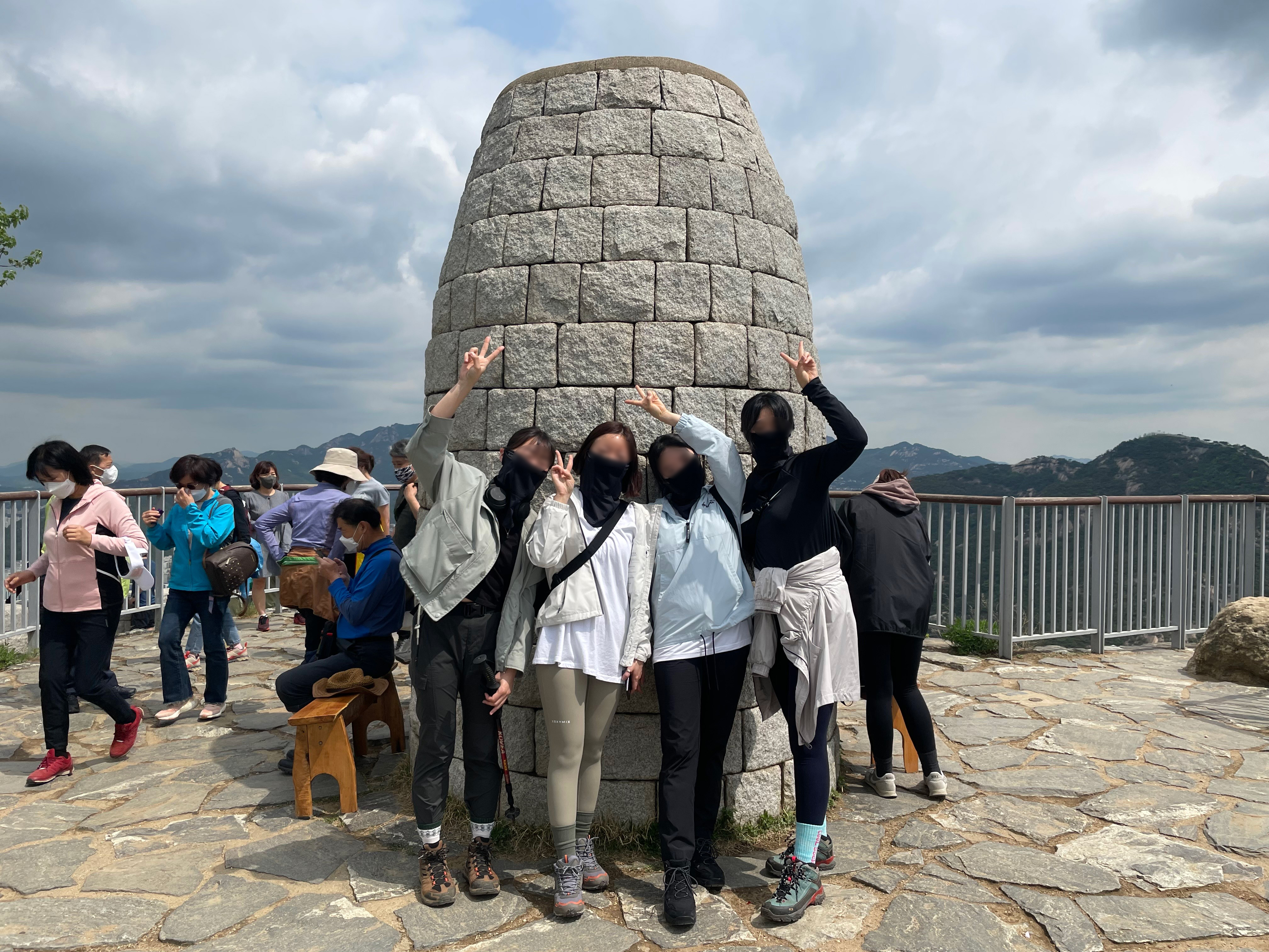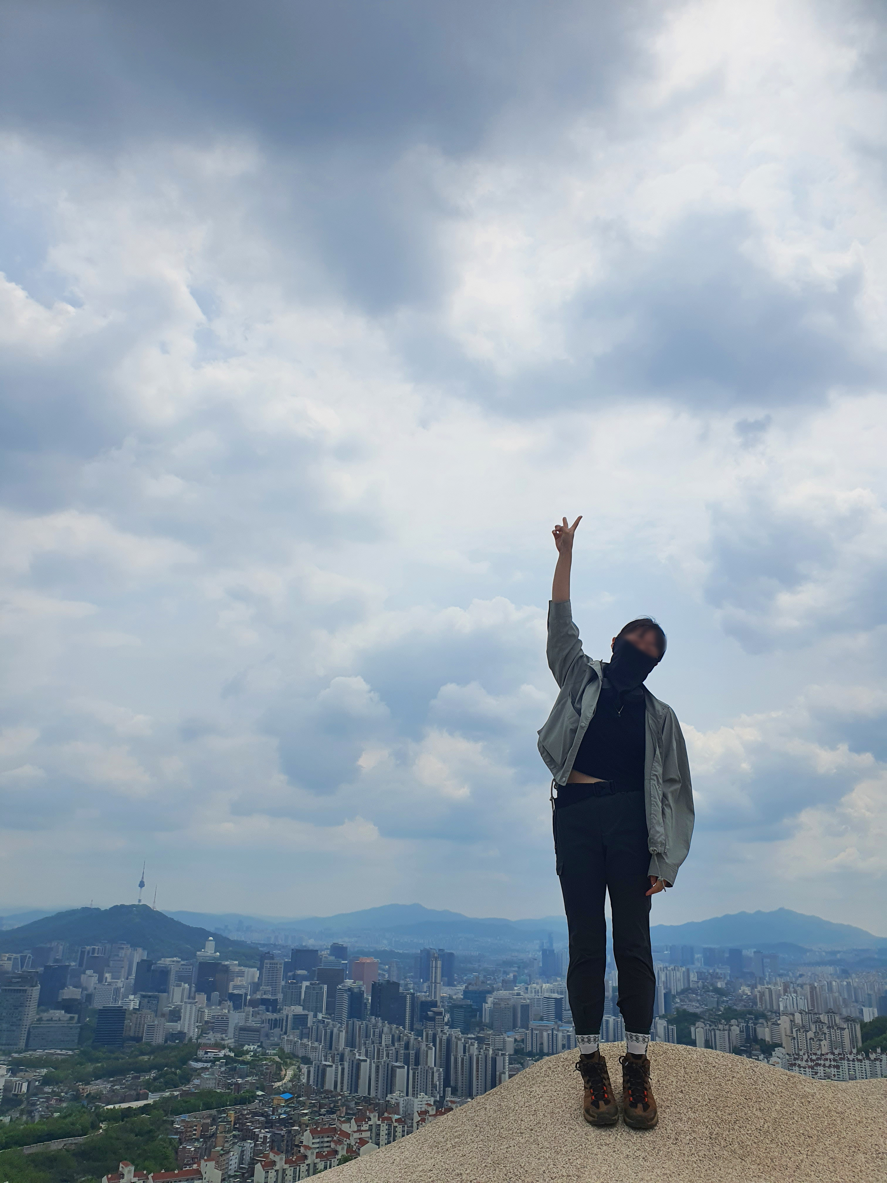 안산의 정상찍기는 쉬웠습니다. 맑은 날씨만큼이나 북적이는 정상의 모습. 운동하니 더웠는지 다들 얼굴이 익었네요. 저 마스크는 운동할 때 껴도 숨쉬기에 전혀 무리가 없다는 광고에 속아 공구한 아이템인데 확실히 KF94 마스크보다는 나았습니다. 대신, 사진 찍을 때 목이 되게 두꺼운 사람처럼 찍혀요, 닌자 서타일... 관악산이라는 첫 번째 등산 이후로 안산의 정상 오르기는 너무 쉬워서인지 빠르게 인왕산으로 옮겨가기로 합니다.