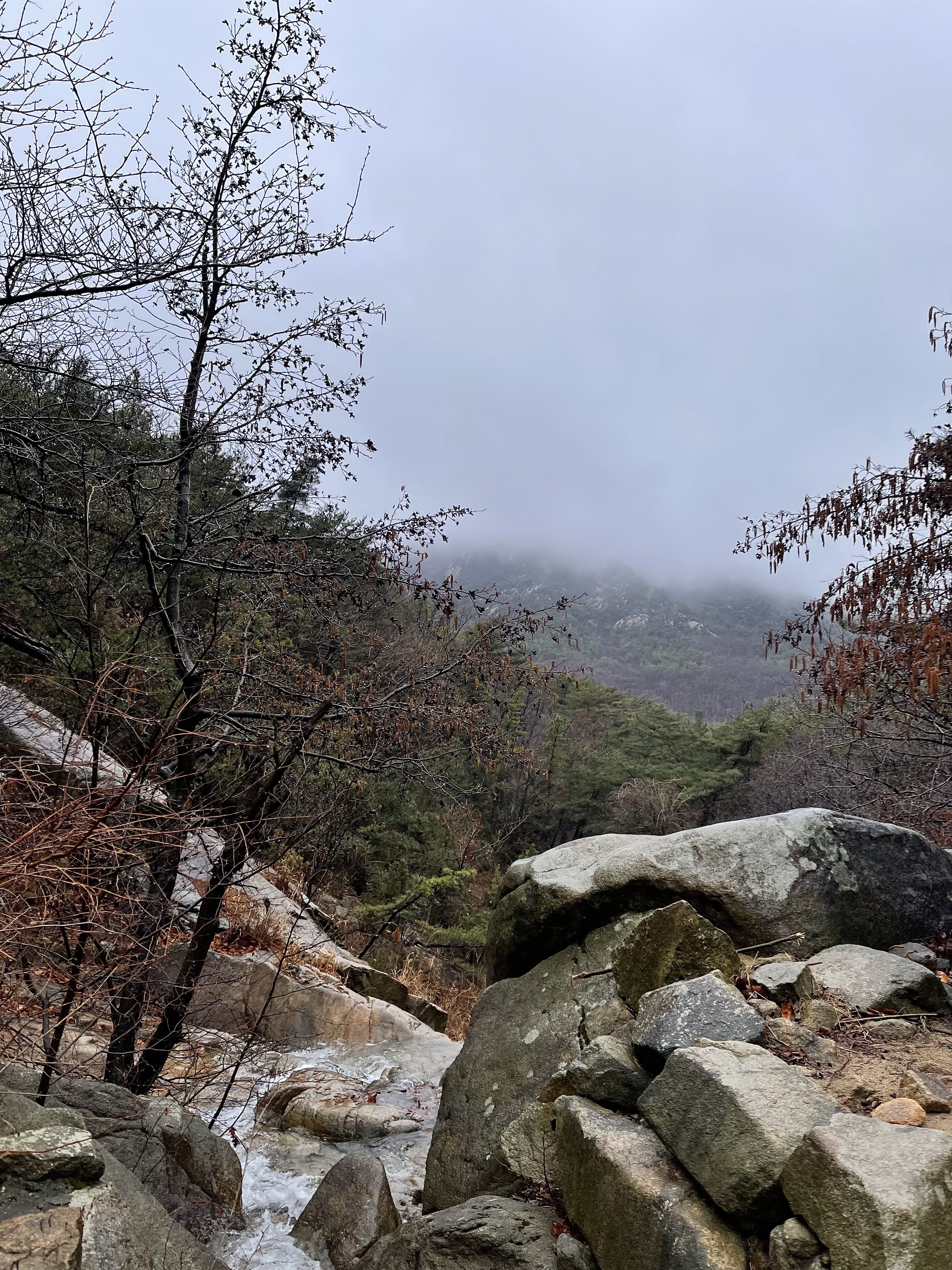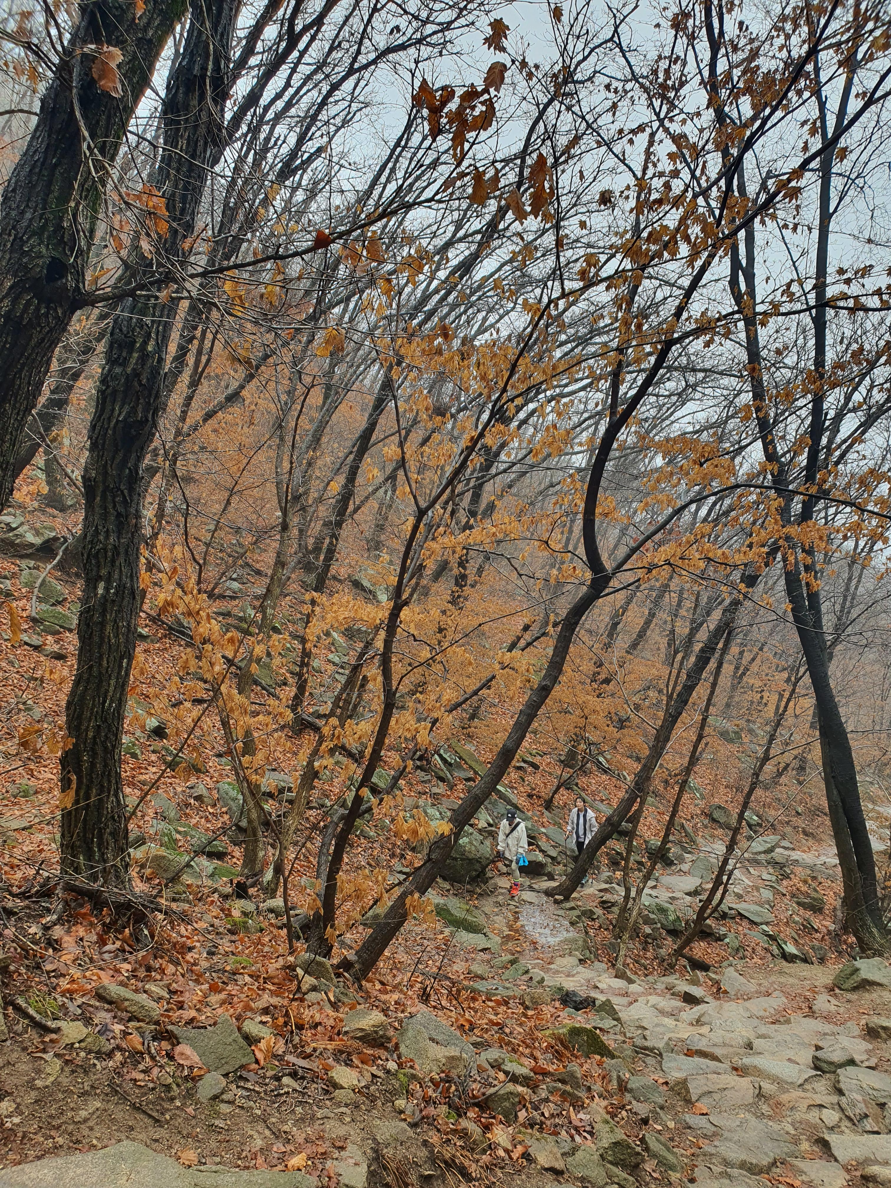 부슬부슬 비가 내리고 있었는데 그래서 그런지 운동하기에 딱 적합했어요. 산악회 회장님을 제외하곤 등산이 처음인 직원들이 대부분이라 비에 젖은 바위에 미끄러지지 않게끔 주의사항도 듣고, 장비 점검 후 사부작사부작 등산을 시작해 봅니다. 생각해보니 이 때 야외활동 중에도 마스크가 필수인 시점이라 KF94 마스크를 끼고 점점 격해지는 호흡을 컨트롤하는 게 너무나 힘들었습니다. 살려줘 내 체력...