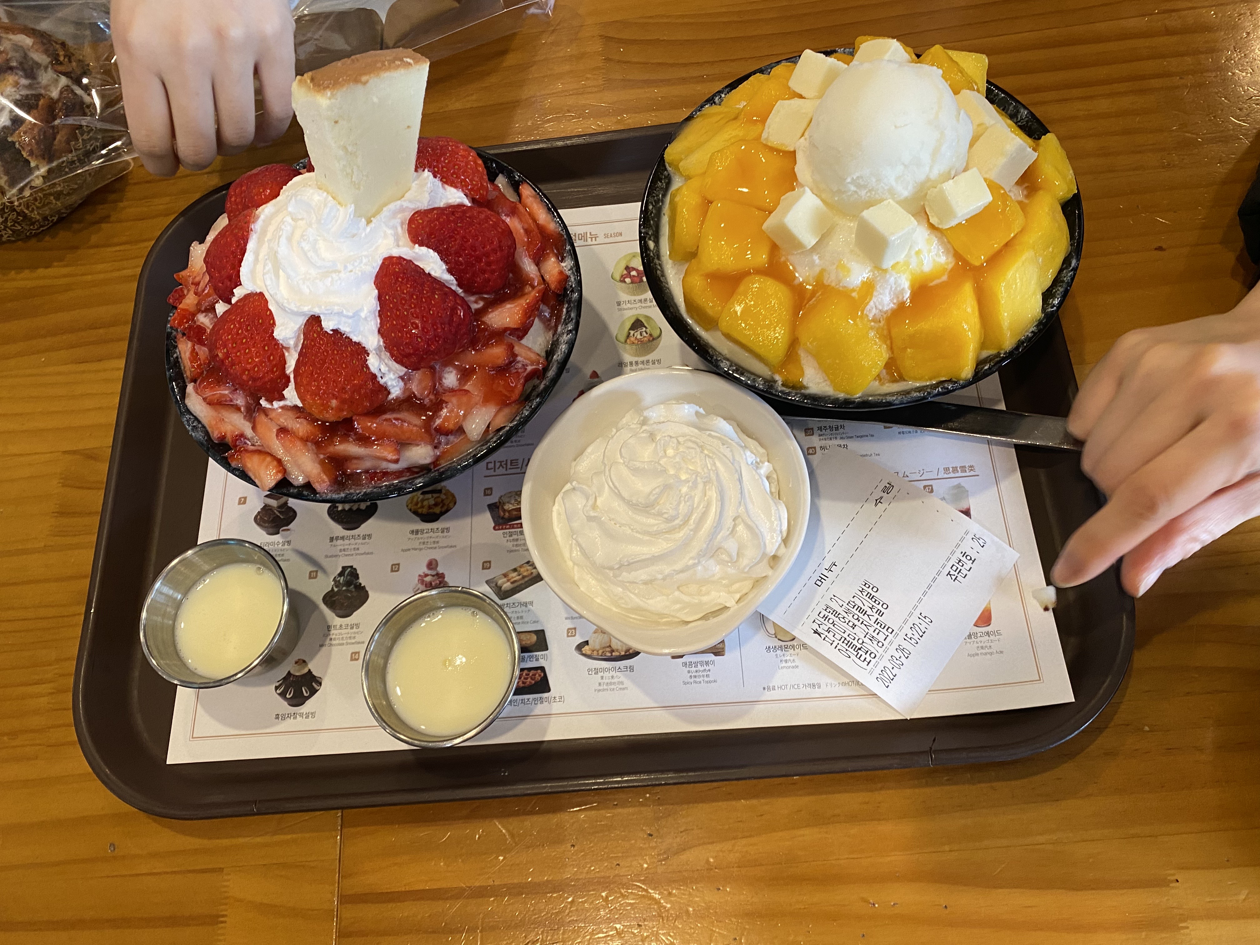 이대로 가긴 아쉽다며 설빙에도 들렀습니다. 비가 와도 배가 불러도 회사 사람들이랑 이렇게 찐하게 오래 지내기 가능한가요? 네? 아 저 사진에 연유 맞아요. 등산으로 소진한 칼로리 만배로 섭취하는 게 사실 저희의 목표였습니다. 다이어트가 무슨 소용인가요. 그런 거 안해도 충분히 이쁘고 젊은걸. 다음 등산 코스를 고민하는 산악회 회장님에게 무한한 감사의 인사를 남기며, 35시간 뒤에 회사에서 보자고 인사를 나눴...